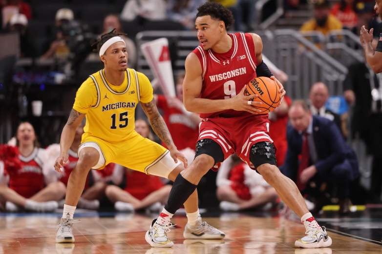 Getty John Tonje #9 de los Wisconsin Badgers es defendido por Rubin Jones #15 de los Michigan Wolverines durante la segunda mitad del campeonato del torneo de baloncesto masculino Big Ten en Gainbridge Fieldhouse el 16 de marzo de 2025 en Indianápolis, Indiana.