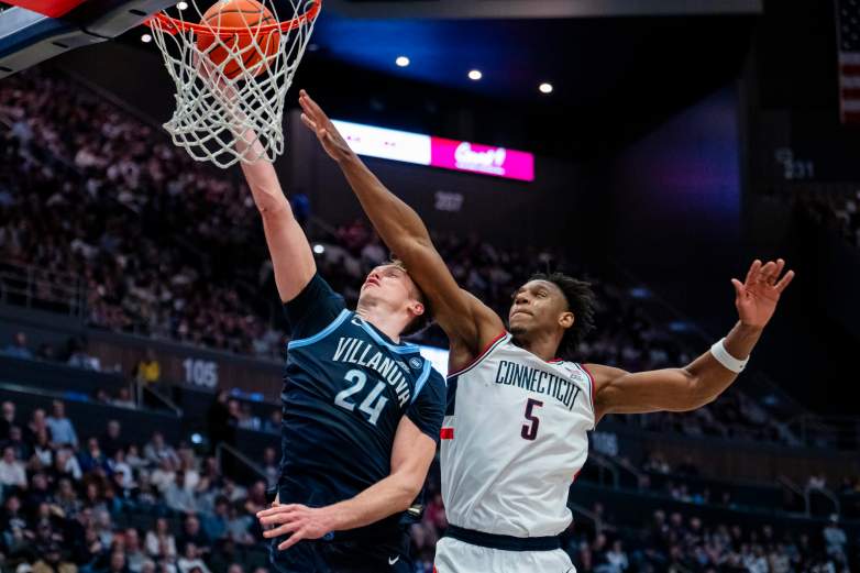 Getty Duke Brennan #24 de los Villanova Wildcats conduce hacia el aro contra Tarris Reed Jr. #5 de los Connecticut Huskies durante la primera mitad de un partido de baloncesto masculino de la NCAA en el PeoplesBank Arena el 24 de enero de 2026 en Hartford, Connecticut.