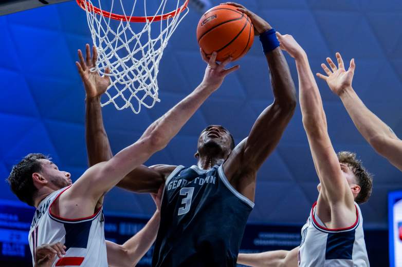 GettyVince Iwuchukwu #3 de los Georgetown Hoyas va por el rebote contra Alex Karaban #11 y Eric Reibe #12 de los Connecticut Huskies durante la segunda mitad del partido de baloncesto masculino de la NCAA en el Harry A. Gampel Pavilion el 14 de febrero de 2026 en Storrs, Connecticut.