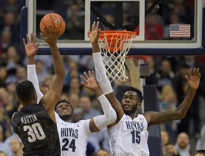 Getty El delantero de Butler Kelan Martin (30), izquierda, empate a 89 puntos cada uno sobre el delantero de Georgetown Marcus Derrickson (24), centro, y el centro de Georgetown Jessie Govan (15) durante la derrota de los Butler Bulldogs de los Georgetown Hoyas 91-89 en doble tiempo extra en baloncesto masculino en Washington DC el 27 de diciembre de 2017.