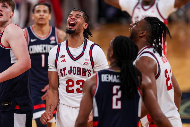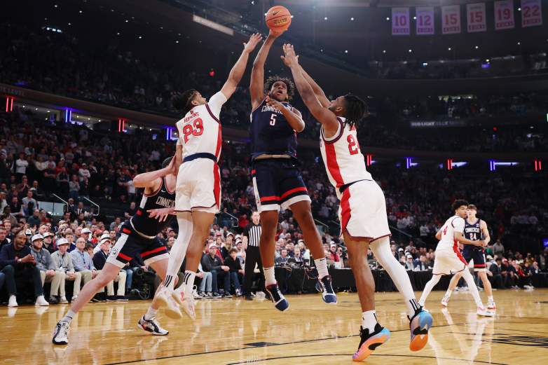 Getty NUEVA YORK, NUEVA YORK – 14 DE MARZO: Tarris Reed Jr. #5 de los Connecticut Huskies va a la canasta mientras Bryce Hopkins #23 y Zuby Ejiofor #24 de los St. John’s Red Storm defienden durante la primera mitad del Big East 2026 Partido del Campeonato del Torneo Masculino del Este contra los Connecticut Huskies en el Madison Square Garden el 14 de marzo de 2026 en la ciudad de Nueva York. (Foto de Sarah Stier/Getty Images)