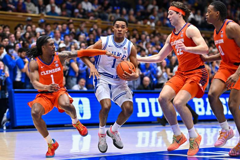 Getty Caleb Foster #1 de los Duke Blue Devils penetra hacia la canasta entre Jestin Porter #1 y Carter Welling #22 de los Clemson Tigers durante la segunda mitad del partido en el Cameron Indoor Stadium el 14 de febrero de 2026 en Durham, Carolina del Norte.
