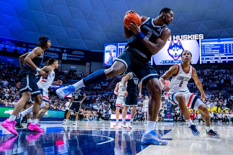 Getty Vince Iwuchukwu #3 de los Georgetown Hoyas obtiene el rebote contra Silas Demary Jr. # 2 de los Connecticut Huskies durante la segunda mitad del partido de baloncesto masculino de la NCAA en el Harry A. Gampel Pavilion el 14 de febrero de 2026 en Storrs, Connecticut.