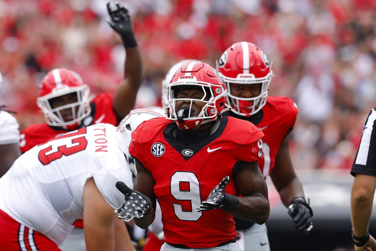 Getty Chris Cole #9 reacciona con Joseph Jonah-Ajonye #99 de los Georgia Bulldogs durante el tercer cuarto contra los Charlotte 49ers en el estadio Sanford el 22 de noviembre de 2025 en Athens, Georgia.