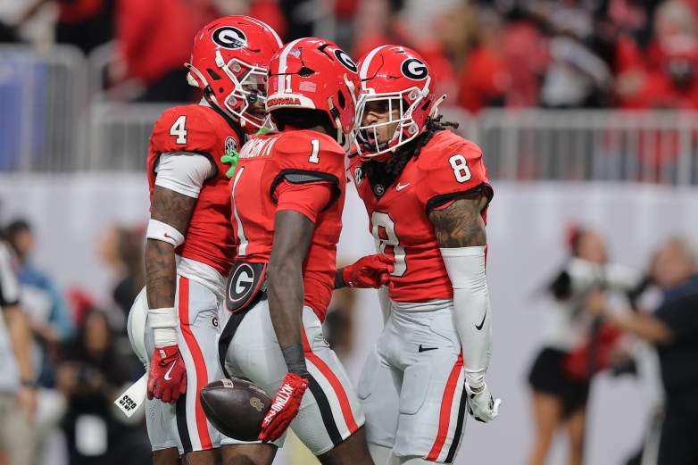 Getty Ellis Robinson IV #1 de los Georgia Bulldogs celebra una intercepción durante la segunda mitad de un juego contra los Georgia Tech Yellow Jackets en el Mercedes-Benz Stadium el 28 de noviembre de 2025 en Atlanta, Georgia.
