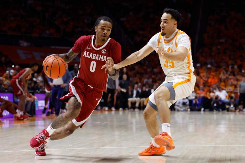 GettyLabaron Philon #0 de Alabama Crimson Tide dribla el balón contra Ethan Burg #35 de Tennessee Volunteers durante la primera mitad del juego en Thompson-Boling Arena el 28 de febrero de 2026 en Knoxville, Tennessee.