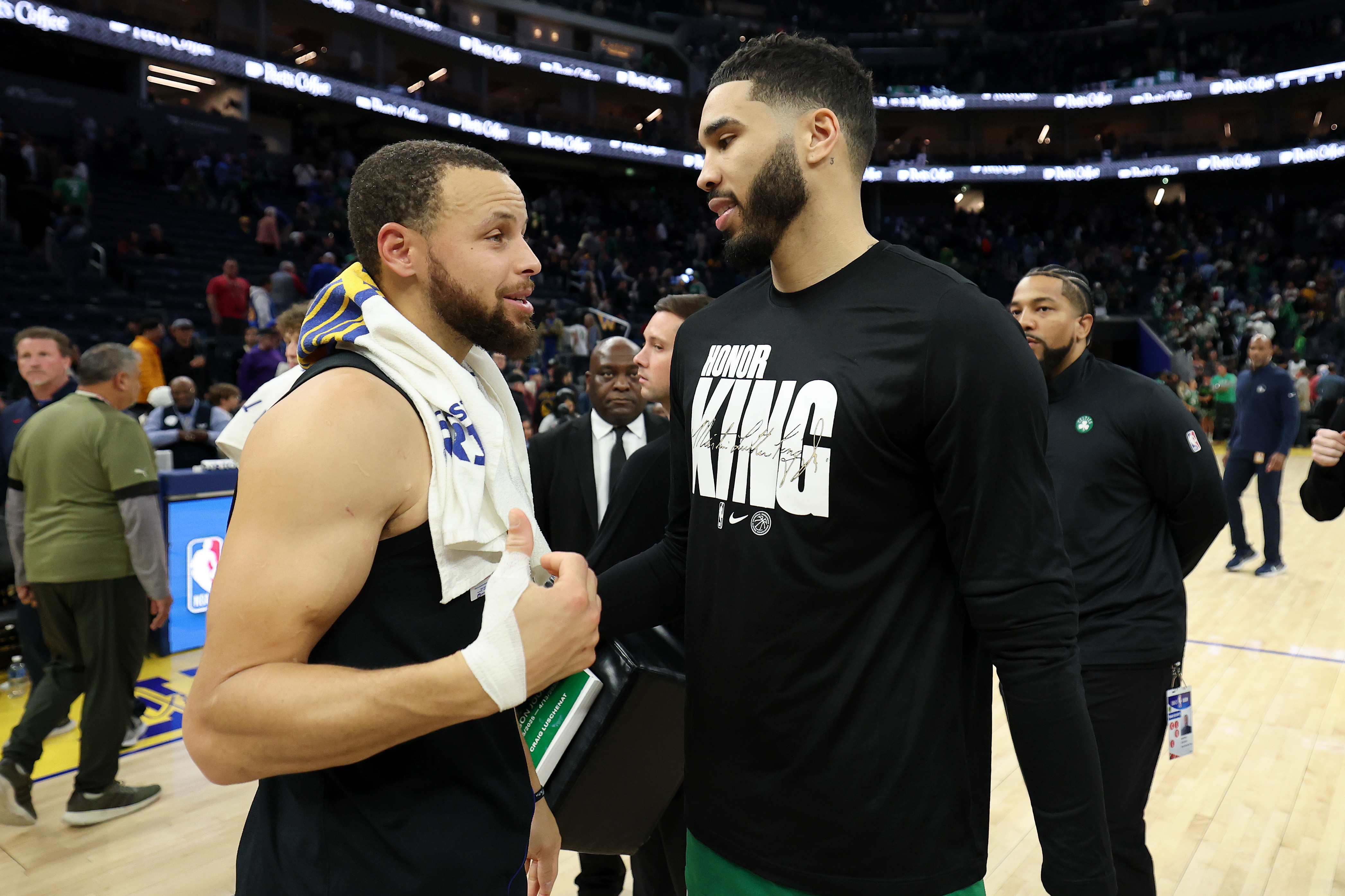Getty SAN FRANCISCO, CALIFORNIA – 20 DE ENERO: Stephen Curry #30 de los Golden State Warriors habla con Jayson Tatum #0 de los Boston Celtics después de su partido en el Chase Center el 20 de enero de 2025 en San Francisco, California. (Foto de Ezra Shaw/Getty Images)