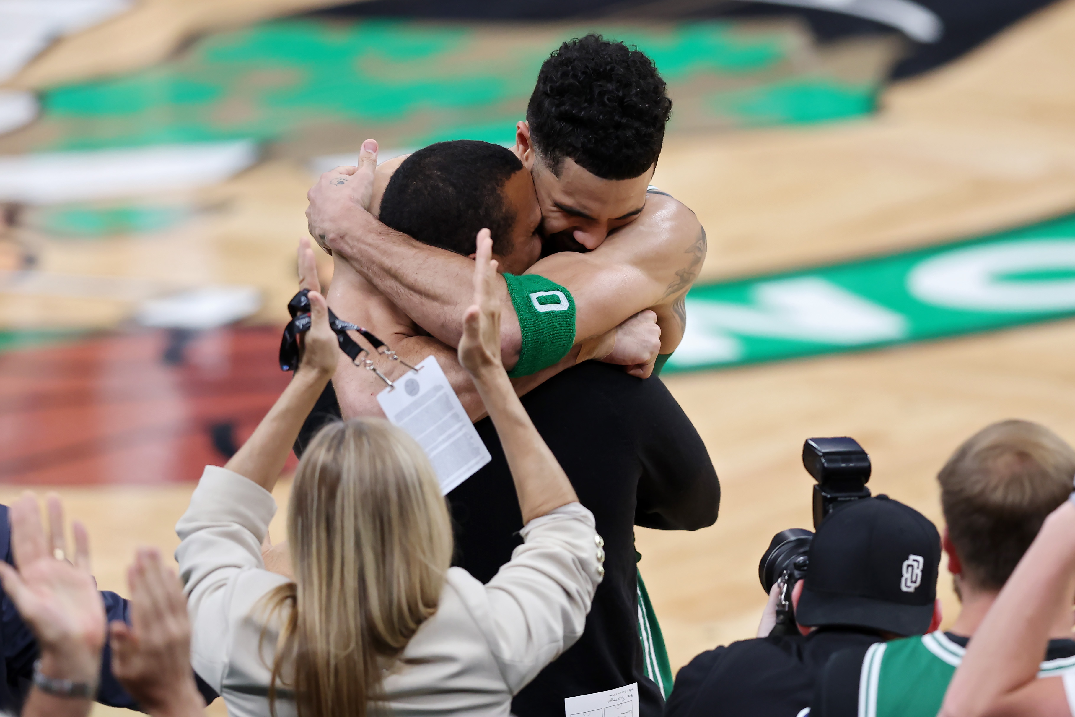 Getty BOSTON, MASSACHUSETTS – 17 DE JUNIO: Jayson Tatum #0 de los Boston Celtics abraza al entrenador Joe Mazzulla de los Boston Celtics durante el cuarto cuarto del Juego Cinco de las Finales de la NBA 2024 contra los Dallas Mavericks en el TD Garden el 17 de junio de 2024 en Boston, Massachusetts. (Foto de Adam Glanzman/Getty Images)