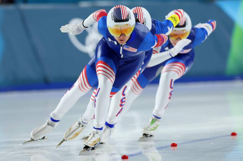 Getty Brittany Bowe, Mia Manganello y Giorgia Birkeland del equipo de Estados Unidos compiten durante los cuartos de final de la persecución por equipos femenina de patinaje de velocidad en el octavo día de los Juegos Olímpicos de Invierno Milano Cortina 2026 en el Estadio de Patinaje de Velocidad de Milán el 14 de febrero de 2026 en Milán, Italia.
