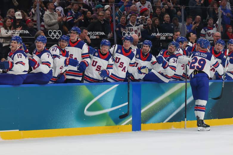 Getty Brock Nelson #29 del equipo de Estados Unidos celebra con sus compañeros tras anotar un gol en el segundo periodo durante el partido preliminar masculino del Grupo C entre Letonia y Estados Unidos en el sexto día de los Juegos Olímpicos de Invierno Milano Cortina 2026 en el Milano Santagiulia Ice Hockey Arena el 12 de febrero de 2026 en Milán, Italia.