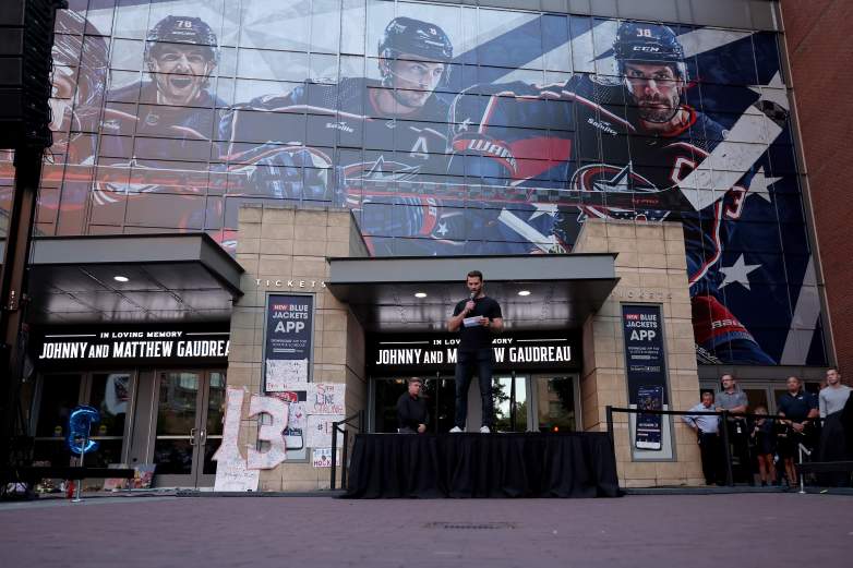 Getty Boone Jenner #38 de los Columbus Blue Jackets habla sobre sus recuerdos de su compañero de equipo Johnny Gaudreau #13 durante una vigilia con velas en memoria de Johnny y Matthew Gaudreau en el Nationwide Arena el 4 de septiembre de 2024 en Columbus, Ohio.