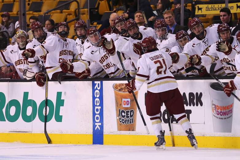 Getty Matthew Gaudreau #21 de los Boston College Eagles celebra con sus compañeros de equipo después de anotar un gol contra los Harvard Crimson durante el tercer período del juego de consolación del Torneo Beanpot 2015 en el TD Garden el 23 de febrero de 2015 en Boston, Massachusetts.