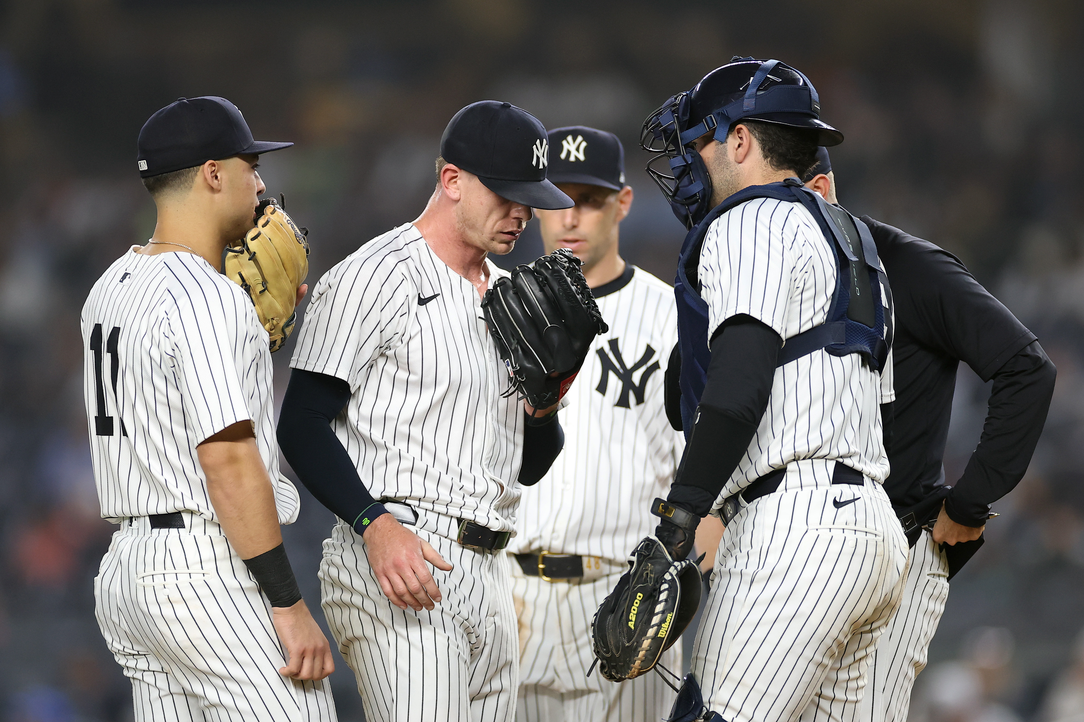 Getty NUEVA YORK, NUEVA YORK – 17 DE JUNIO: Los Yankees de Nueva York se reúnen en el montículo con Ian Hamilton #71 de los Yankees de Nueva York durante la novena entrada contra los Angelinos de Los Ángeles en el Yankee Stadium el 17 de junio de 2025 en el distrito del Bronx de la ciudad de Nueva York. Los Angelinos ganaron 4-0. (Foto de Sarah Stier/Getty Images)