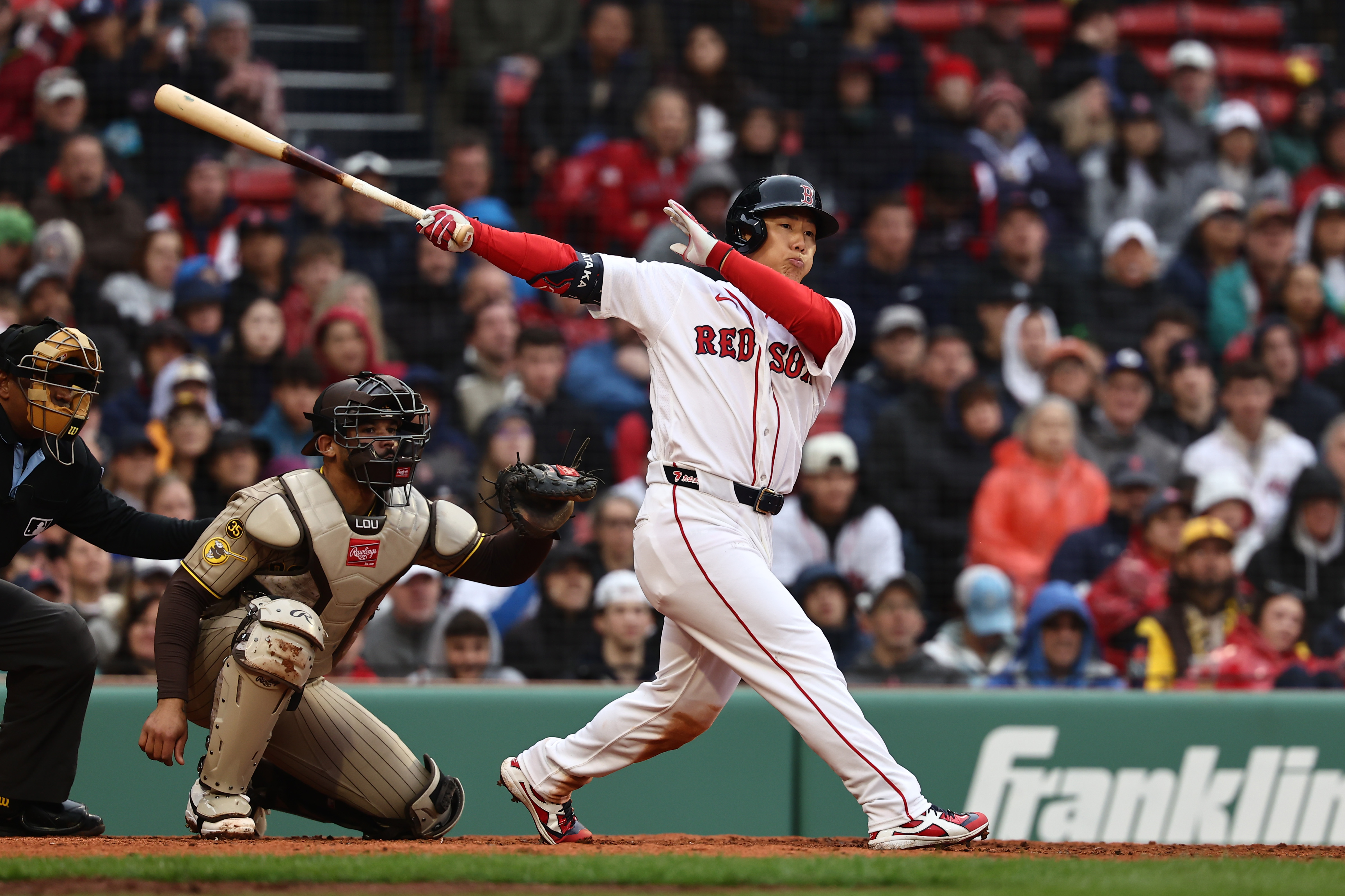 Getty BOSTON, MA – 5 DE ABRIL: Masataka Yoshida #7 de los Boston Red Sox completa su doble de dos carreras contra los San Diego Padres durante la séptima entrada en Fenway Park el 5 de abril de 2026 en Boston, Massachusetts. (Foto de Winslow Townson/Getty Images)