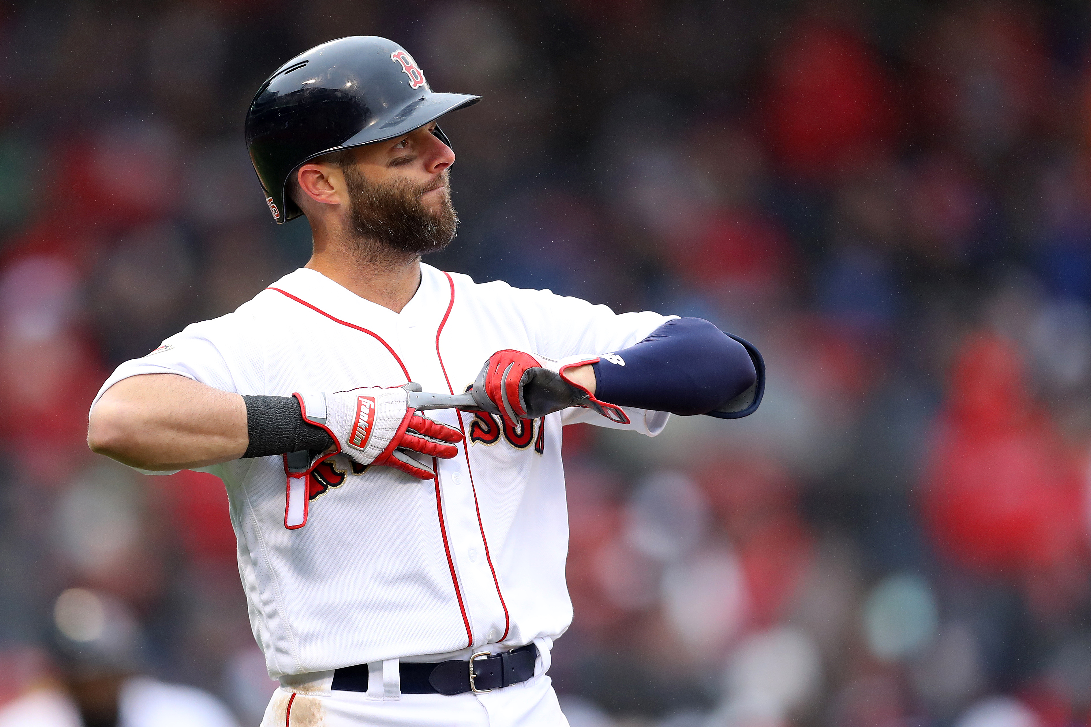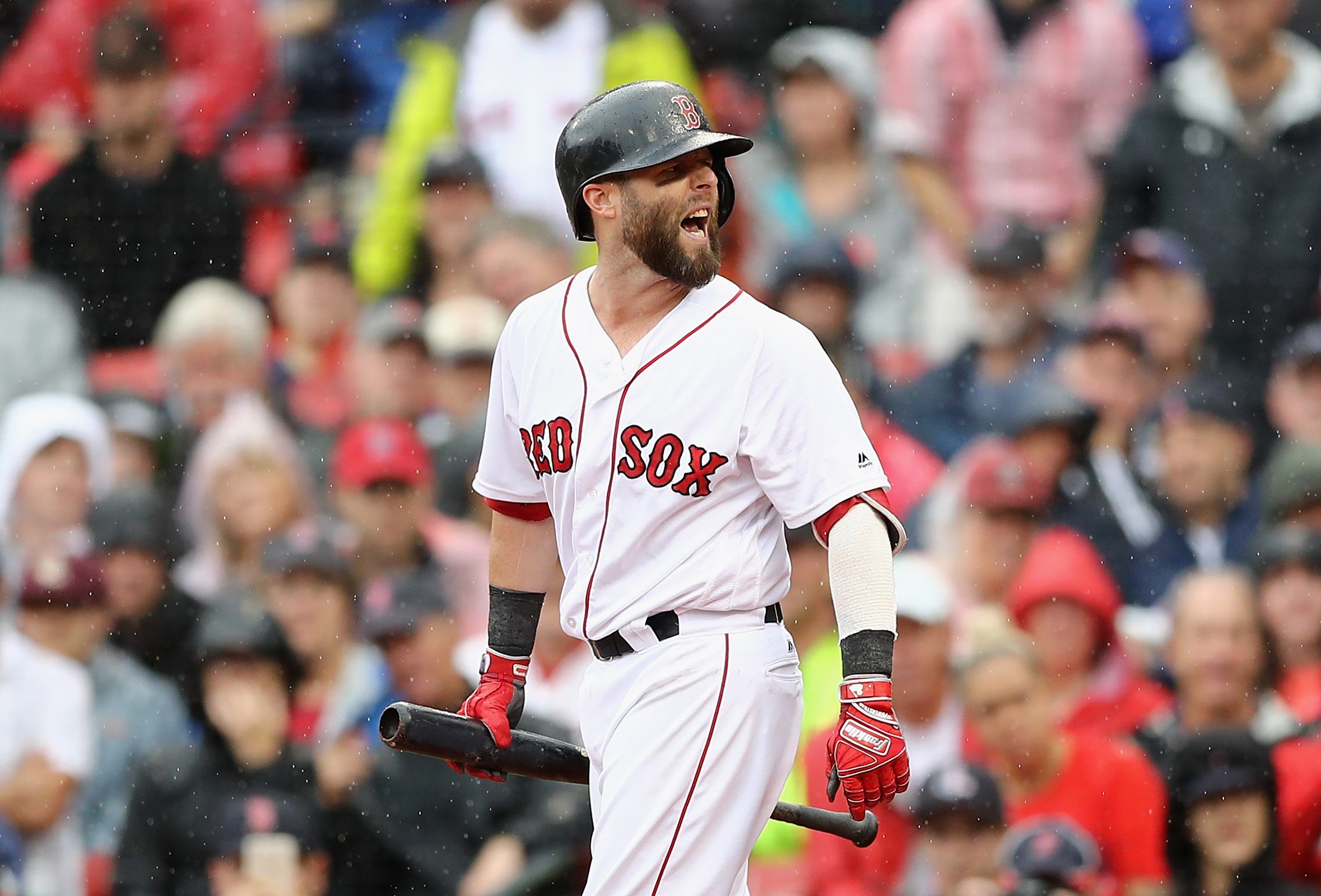 Getty Dustin Pedroia #15 de los Boston Red Sox reacciona durante la sexta entrada del juego inaugural en casa de los Red Sox contra los Toronto Blue Jays en Fenway Park el 9 de abril de 2019 en Boston, Massachusetts.