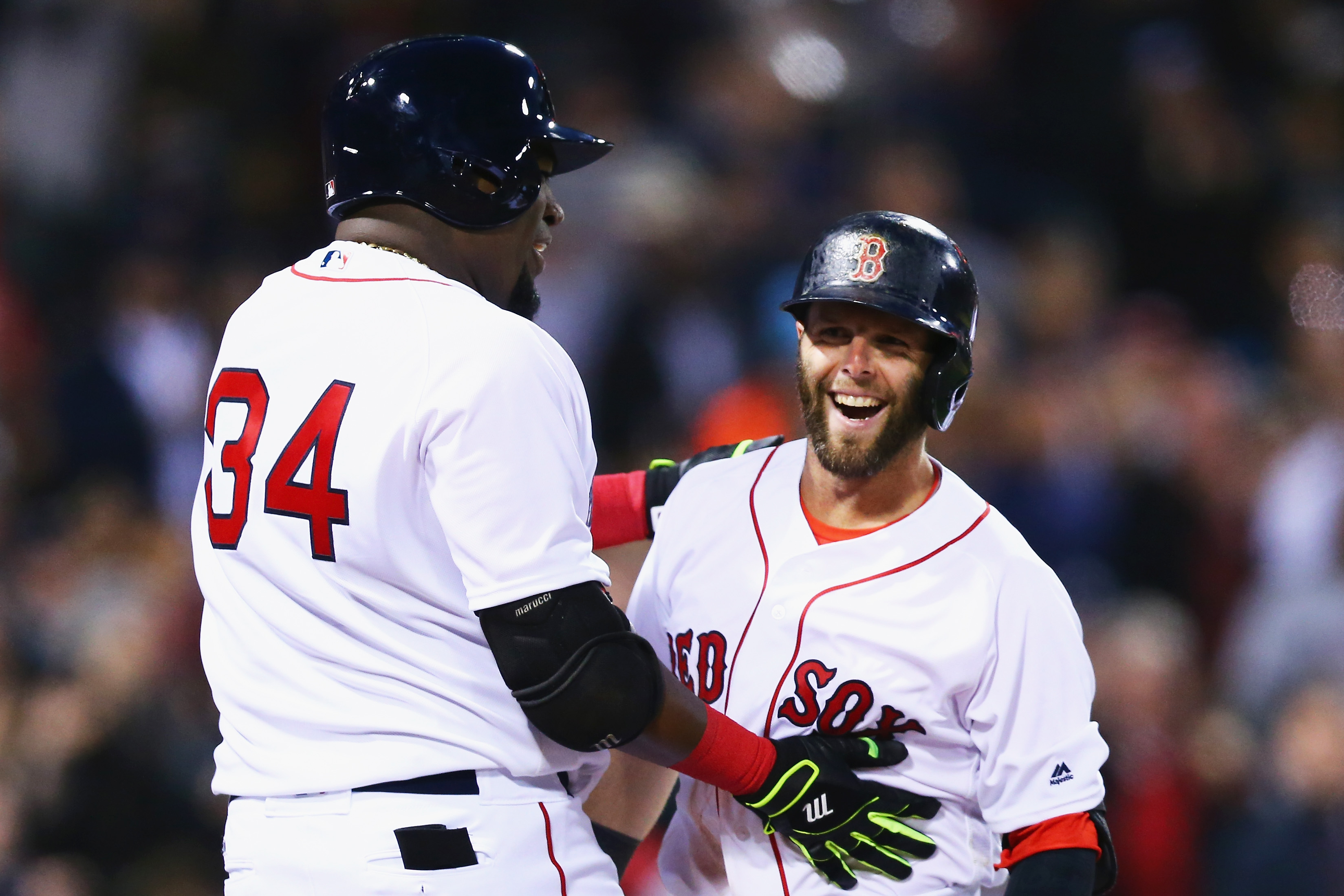 Getty David Ortiz #34 de los Boston Red Sox felicita a Dustin Pedroia #15 después de que bateara un grand slam durante la segunda entrada contra los Atlanta Braves el 27 de abril de 2016 en Boston, Massachusetts.