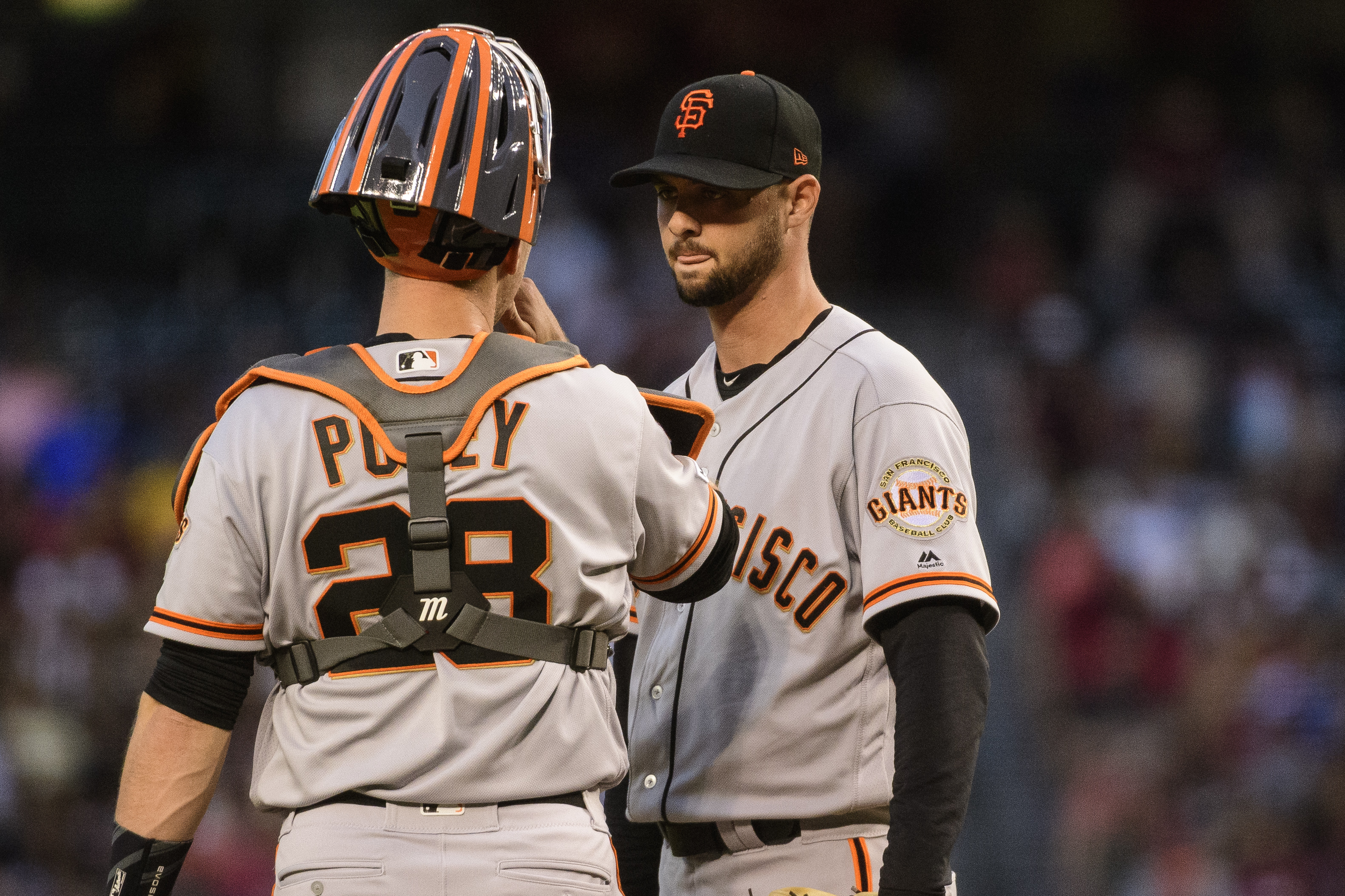 Getty 22 DE JUNIO: Buster Posey #28 y Tyler Beede #38 de los Gigantes de San Francisco hablan en el montículo en la primera entrada del juego de la MLB contra los Diamondbacks de Arizona en Chase Field el 22 de junio de 2019 en Phoenix, Arizona.