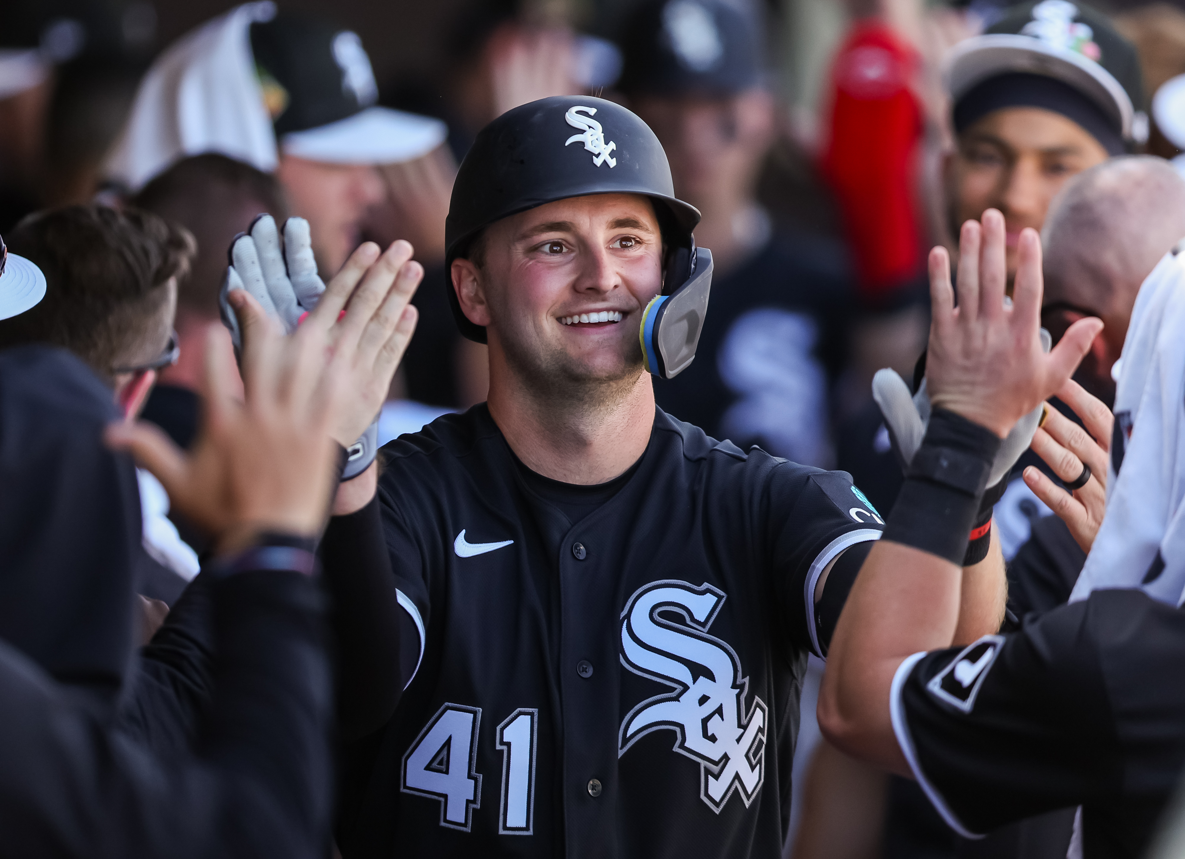 Getty Tanner Murray #41 de los Chicago White Sox choca las cinco con sus compañeros de equipo después de su jonrón en la segunda entrada contra los Seattle Mariners durante su juego de entrenamiento de primavera en el Peoria Stadium el 24 de febrero de 2026 en Peoria, Arizona.
