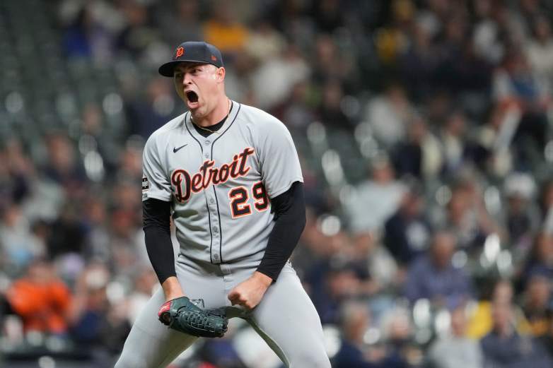 MILWAUKEE, WISCONSIN – 14 DE ABRIL: Tarik Skubal #29 de los Tigres de Detroit celebra después de ponchar a Rhys Hoskins #12 de los Cerveceros de Milwaukee durante la sexta entrada en el American Family Field el 14 de abril de 2025 en Milwaukee, Wisconsin. (Foto de Patrick McDermott/Getty Images)
