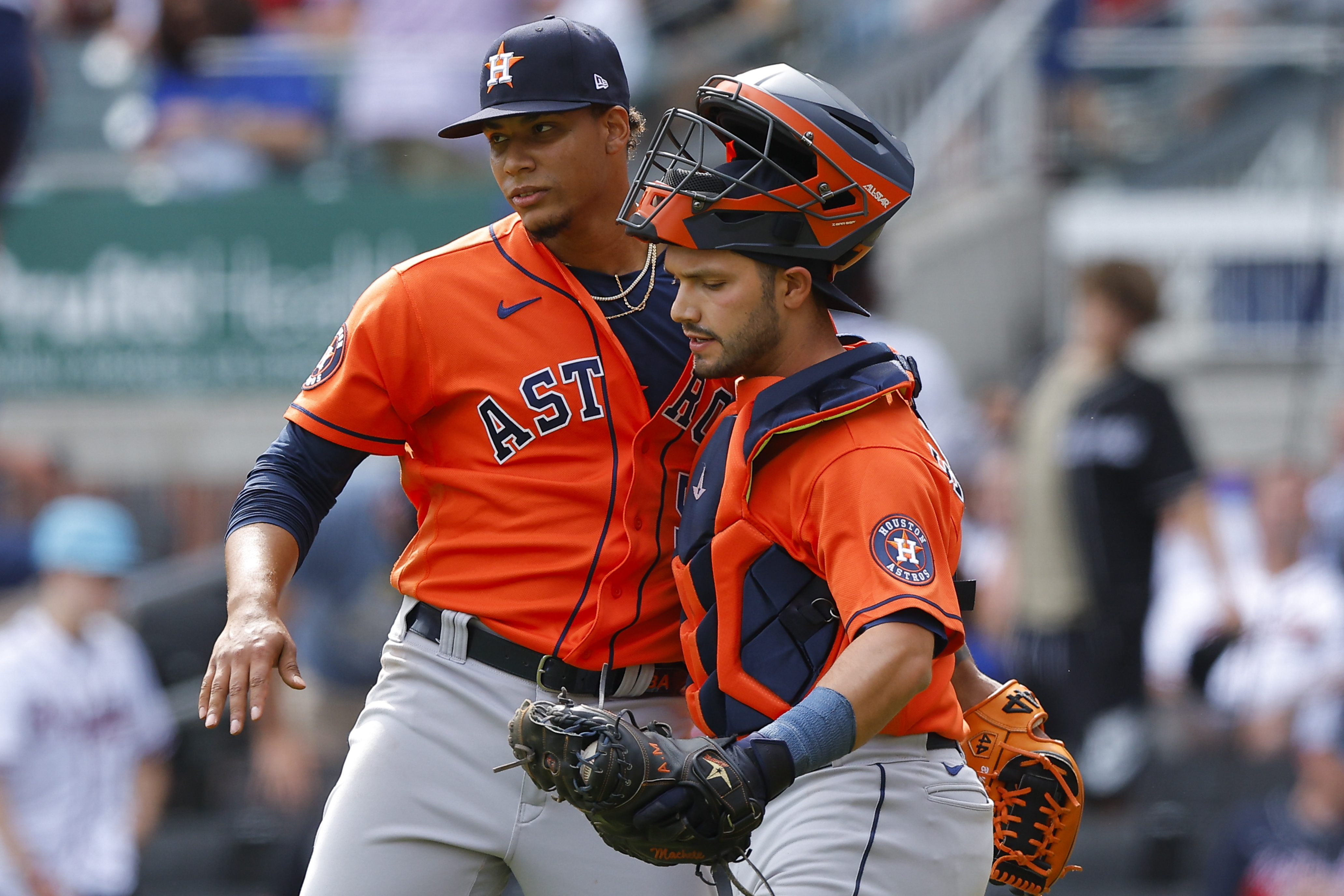 Getty ATLANTA, GA – 23 DE ABRIL: Bryan Abreu #52 reacciona con César Salazar #18 de los Astros de Houston después de derrotar a los Bravos de Atlanta 5-2 en Truist Park el 23 de abril de 2023 en Atlanta, Georgia. (Foto de Todd Kirkland/Getty Images)