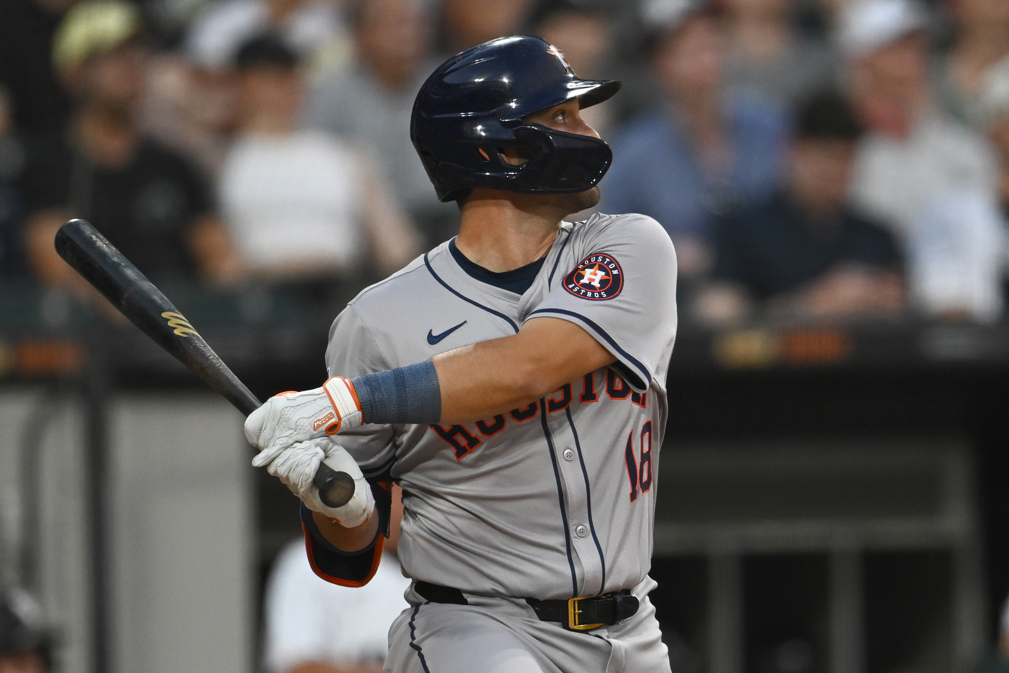 Getty CHICAGO, ILLINOIS – 19 DE JUNIO: César Salazar #18 de los Astros de Houston conecta un sencillo productor de carrera en la cuarta entrada contra los Medias Blancas de Chicago en Guaranteed Rate Field el 19 de junio de 2024 en Chicago, Illinois. (Foto de Quinn Harris/Getty Images)
