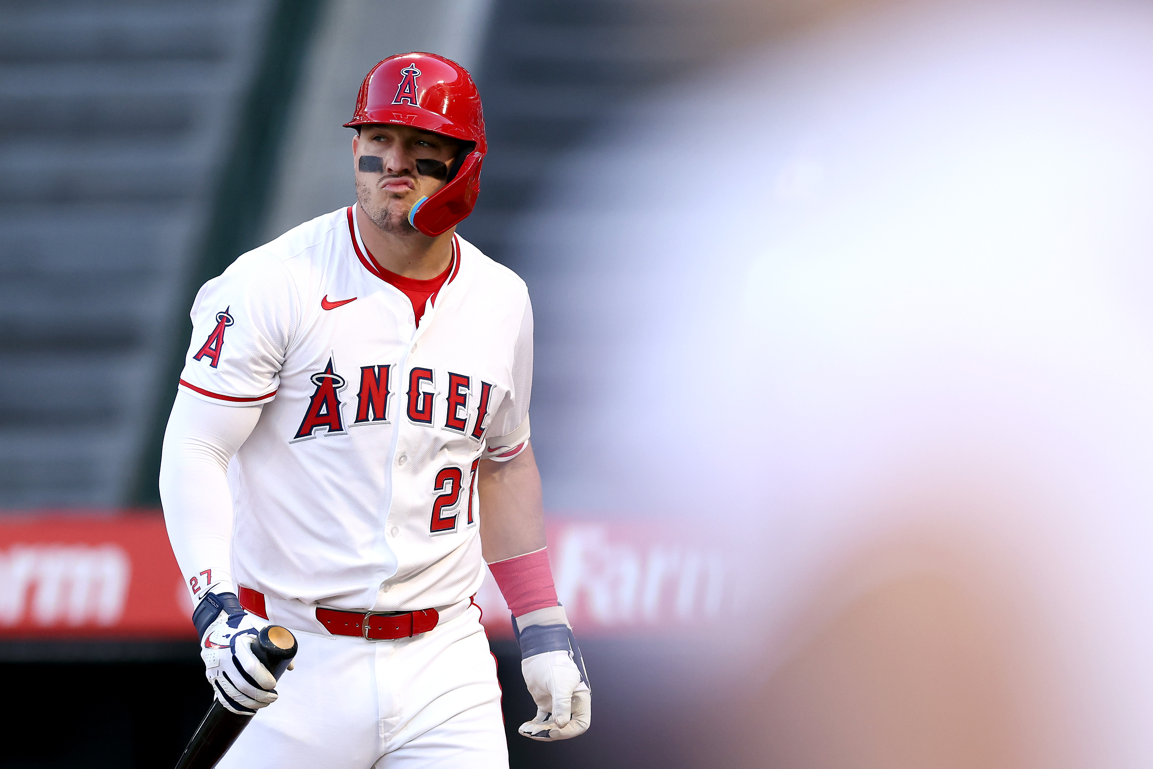 Getty Mike Trout #27 de los Angels de Los Ángeles reacciona después de poncharse durante la primera entrada contra los Rays de Tampa Bay en el Angel Stadium de Anaheim el 4 de agosto de 2025 en Anaheim, California.