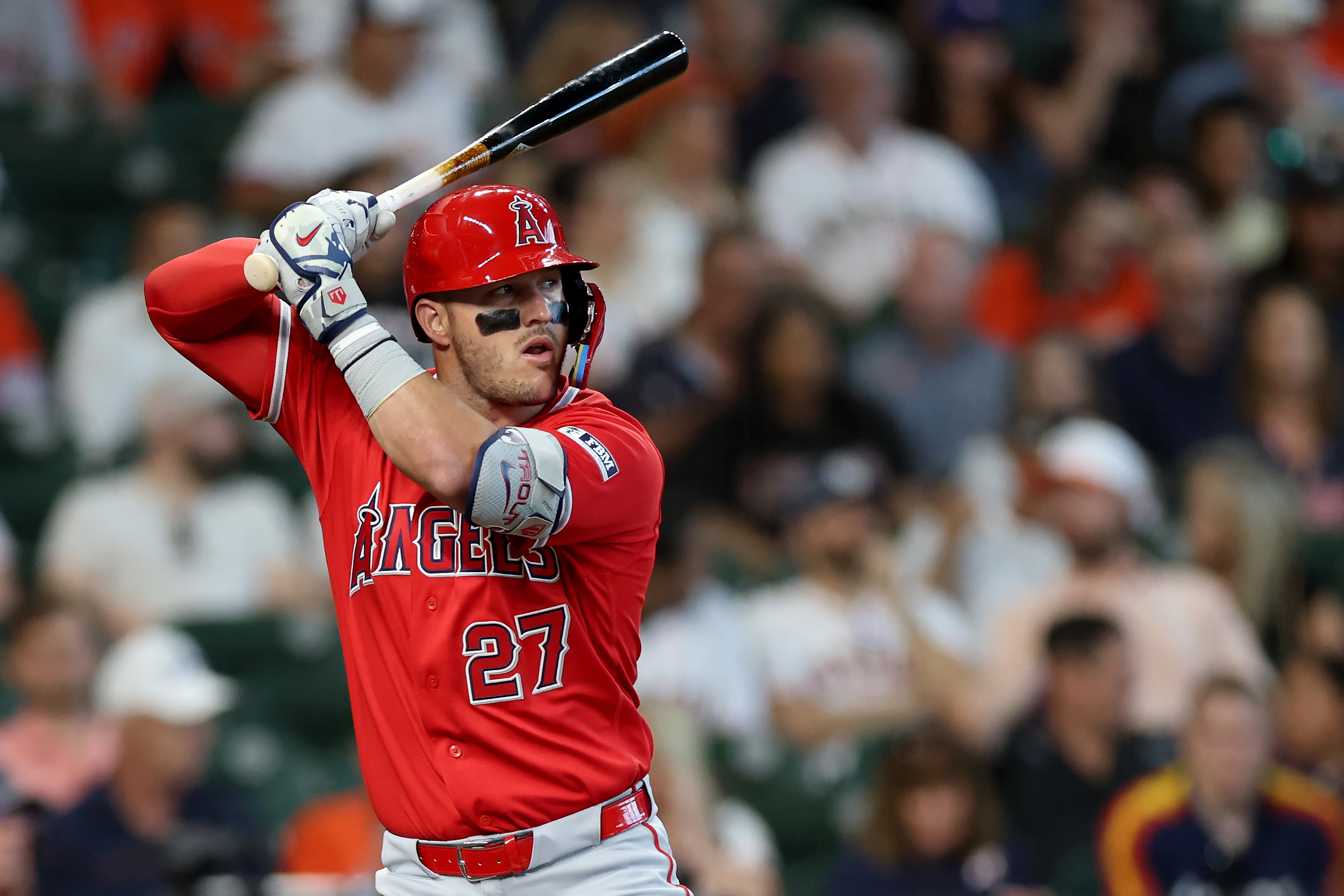 Getty Mike Trout #27 de los Angelinos de Los Ángeles batea en la primera entrada contra los Astros de Houston en el Día Inaugural en Daikin Park el 26 de marzo de 2026 en Houston, Texas.