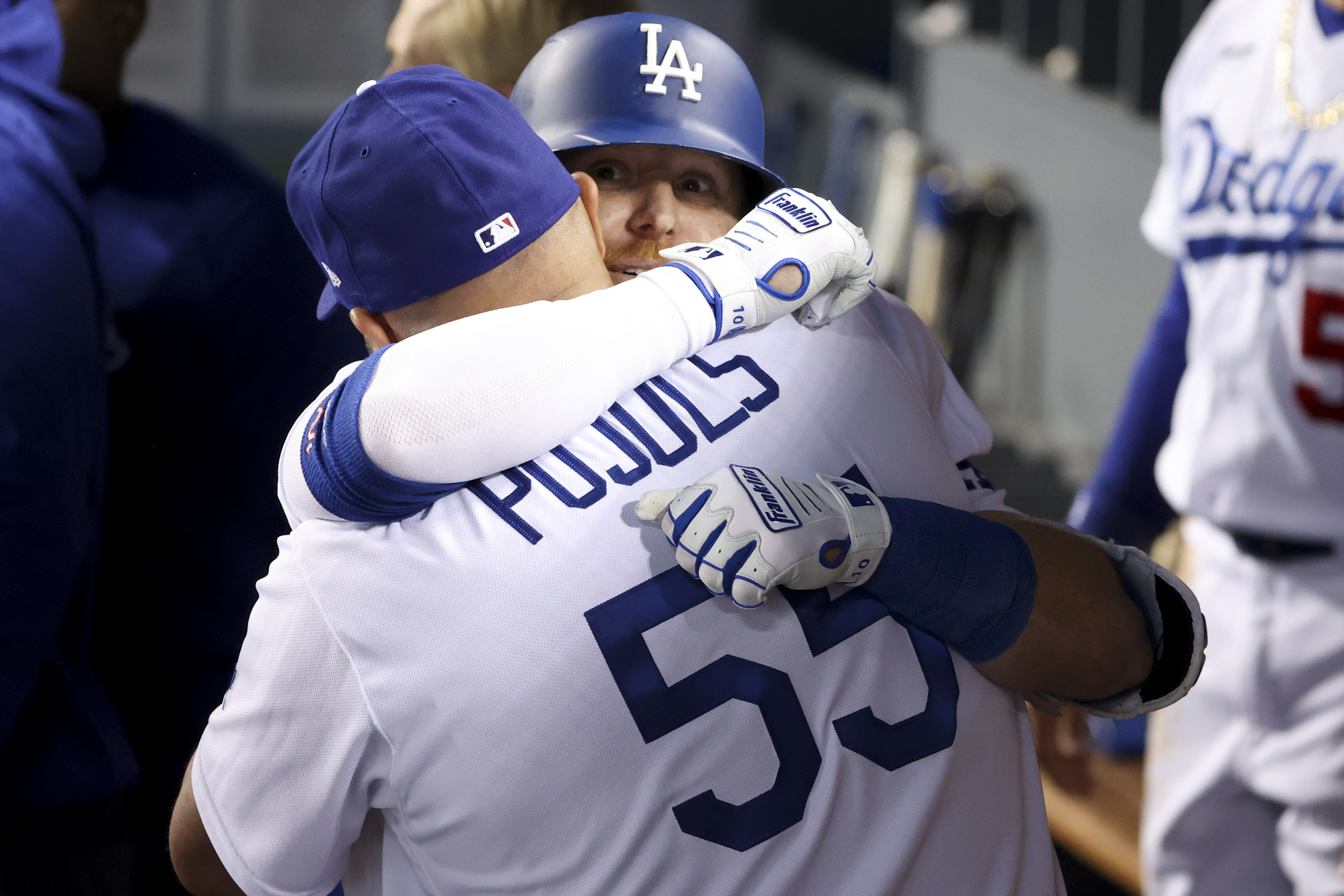 Getty Los Ángeles, CA – 6 de octubre: Justin Turner de los Dodgers de Los Ángeles, de espaldas, abraza a Albert Pujols en el banquillo después de conectar un jonrón solitario para empatar el juego durante la cuarta entrada contra los Cardenales de San Luis en el Dodger Stadium el miércoles 6 de octubre de 2021 en Los Ángeles, CA. (Robert Gauthier / Los Angeles Times vía Getty Images)