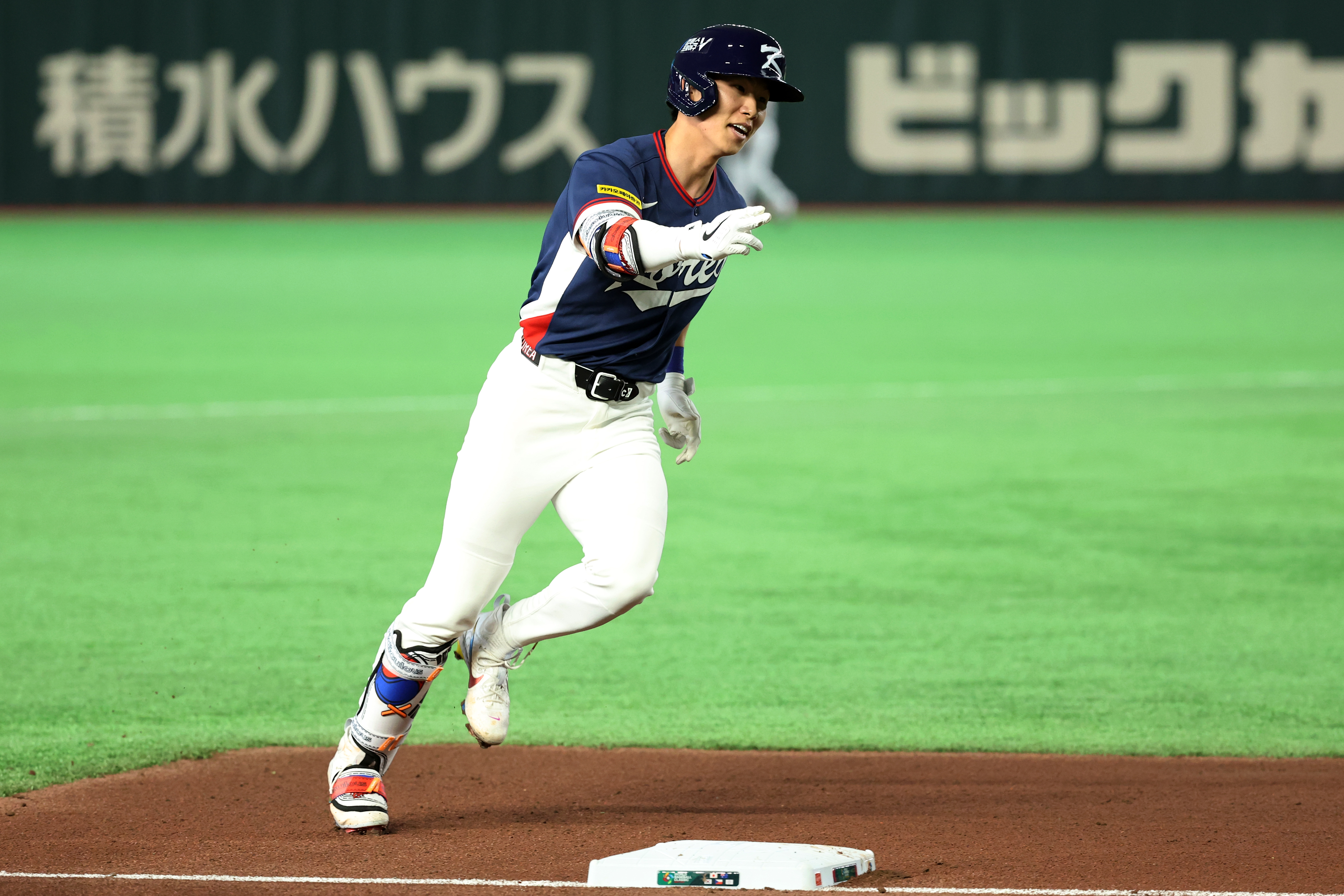 GettyHyeseong Kim #3 del Equipo de la República de Corea celebra después de conectar un jonrón de dos carreras en la cuarta entrada durante el juego del Grupo C del Clásico Mundial de Béisbol 2026 entre Corea del Sur y Japón en el Tokyo Dome el 7 de marzo de 2026 en Tokio, Japón.
