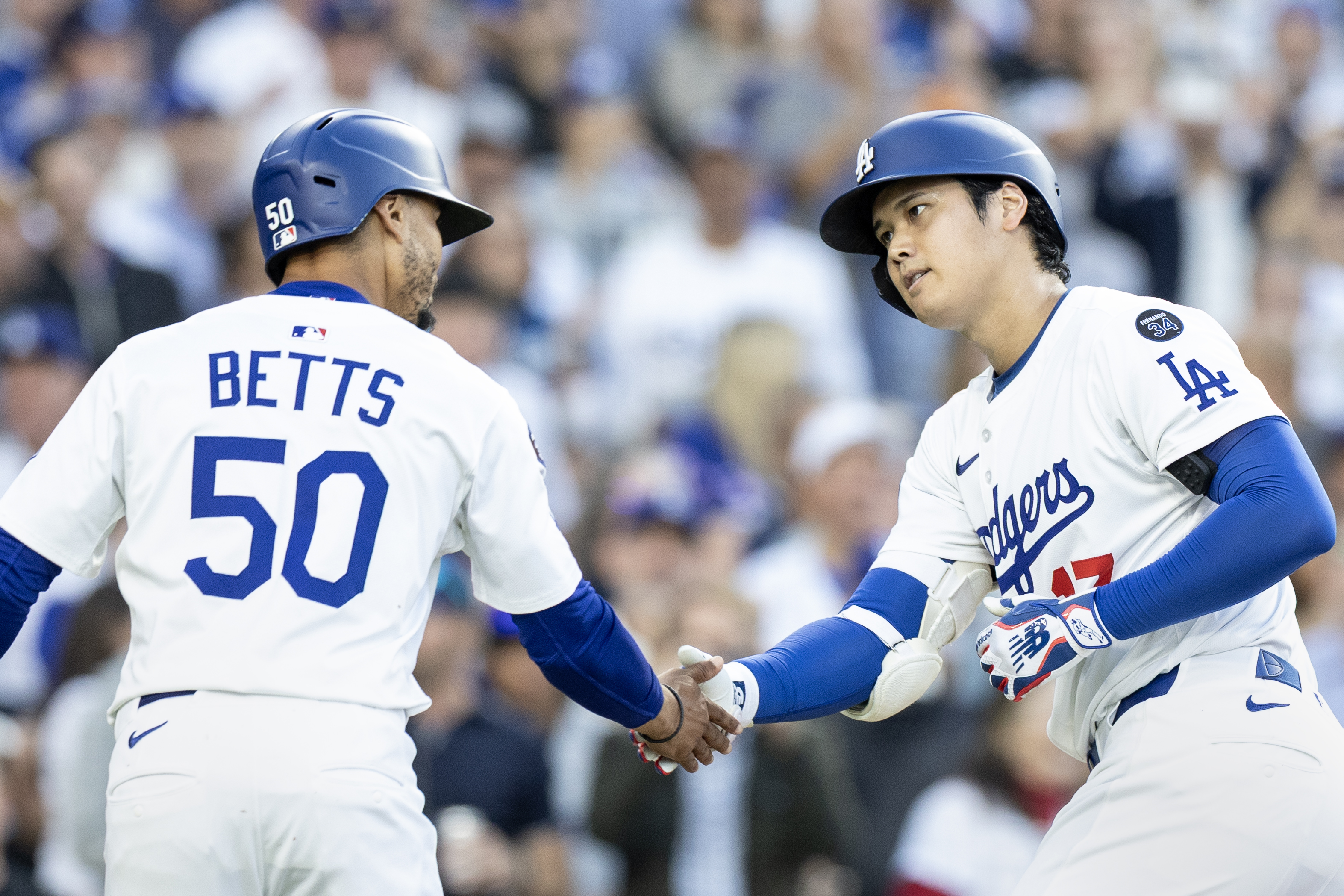 Getty La estrella de los Dodgers de Los Ángeles Shohei Ohtani celebra con Mookie Betts después de conectar un jonrón de dos carreras mientras los Dodgers se enfrentan a los Minnesota Twins en el Dodger Stadium el lunes 21 de julio de 2025 en Los Ángeles, CA.
