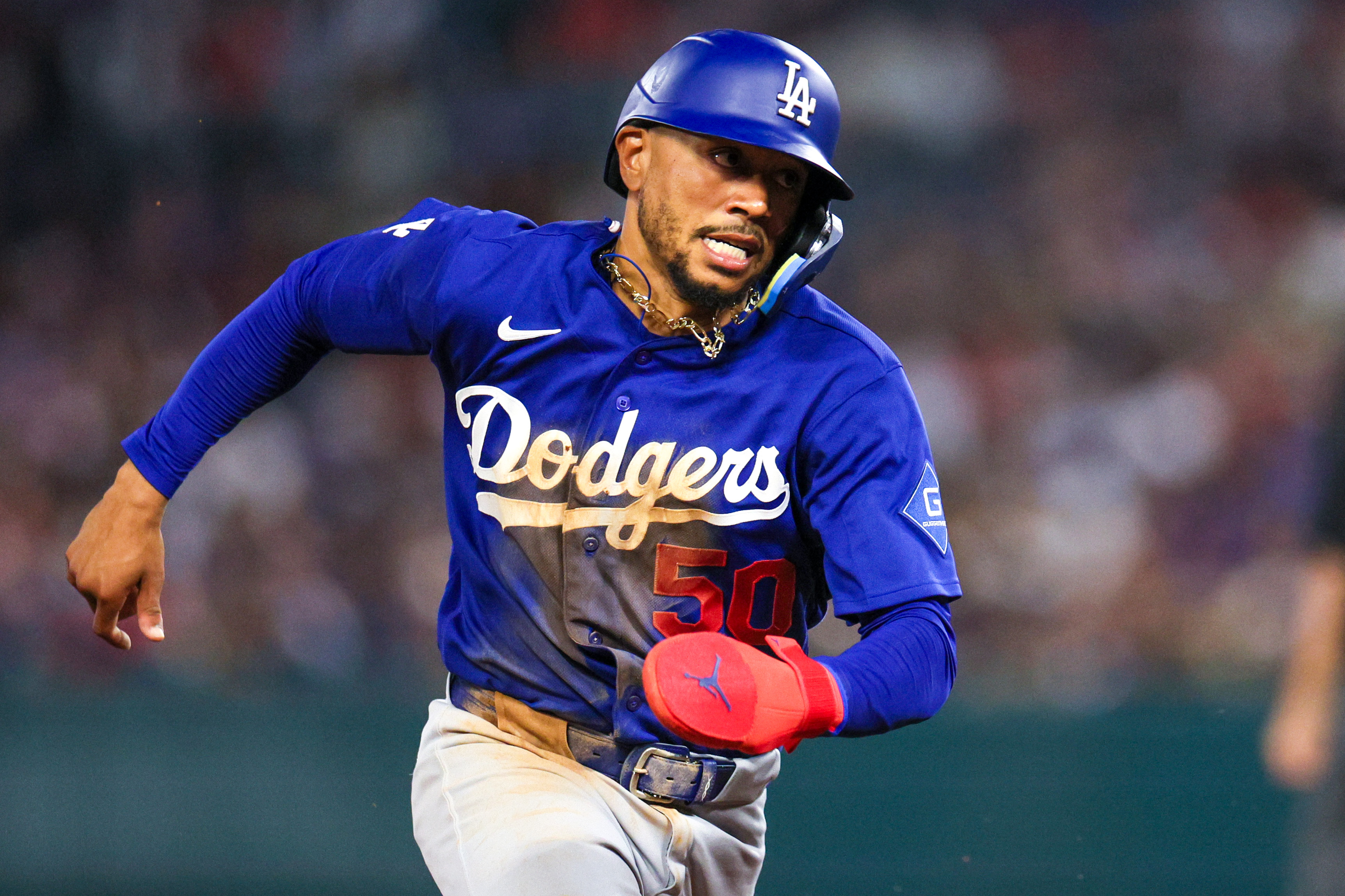 Getty Mookie Betts (50) de los Dodgers de Los Ángeles recorre las bases para anotar durante la quinta entrada de un juego de entrenamiento de primavera de la MLB contra los Angels de Los Ángeles en el Angel Stadium el domingo 22 de marzo de 2026 en Anaheim, CA.