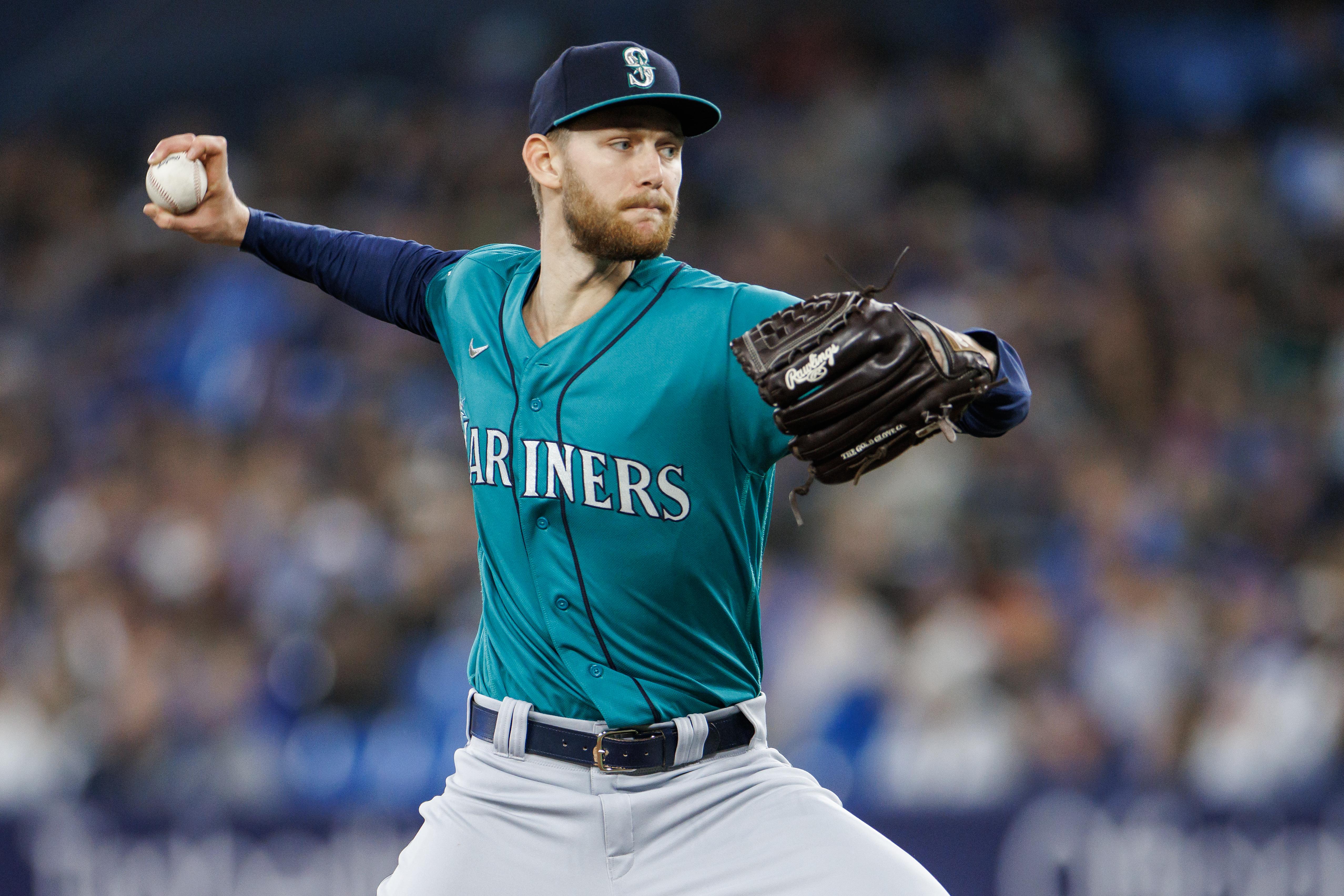 Getty Easton McGee #59 de los Marineros de Seattle lanza contra los Azulejos de Toronto en la primera entrada de su juego de la MLB en el Rogers Centre el 29 de abril de 2023 en Toronto, Canadá.