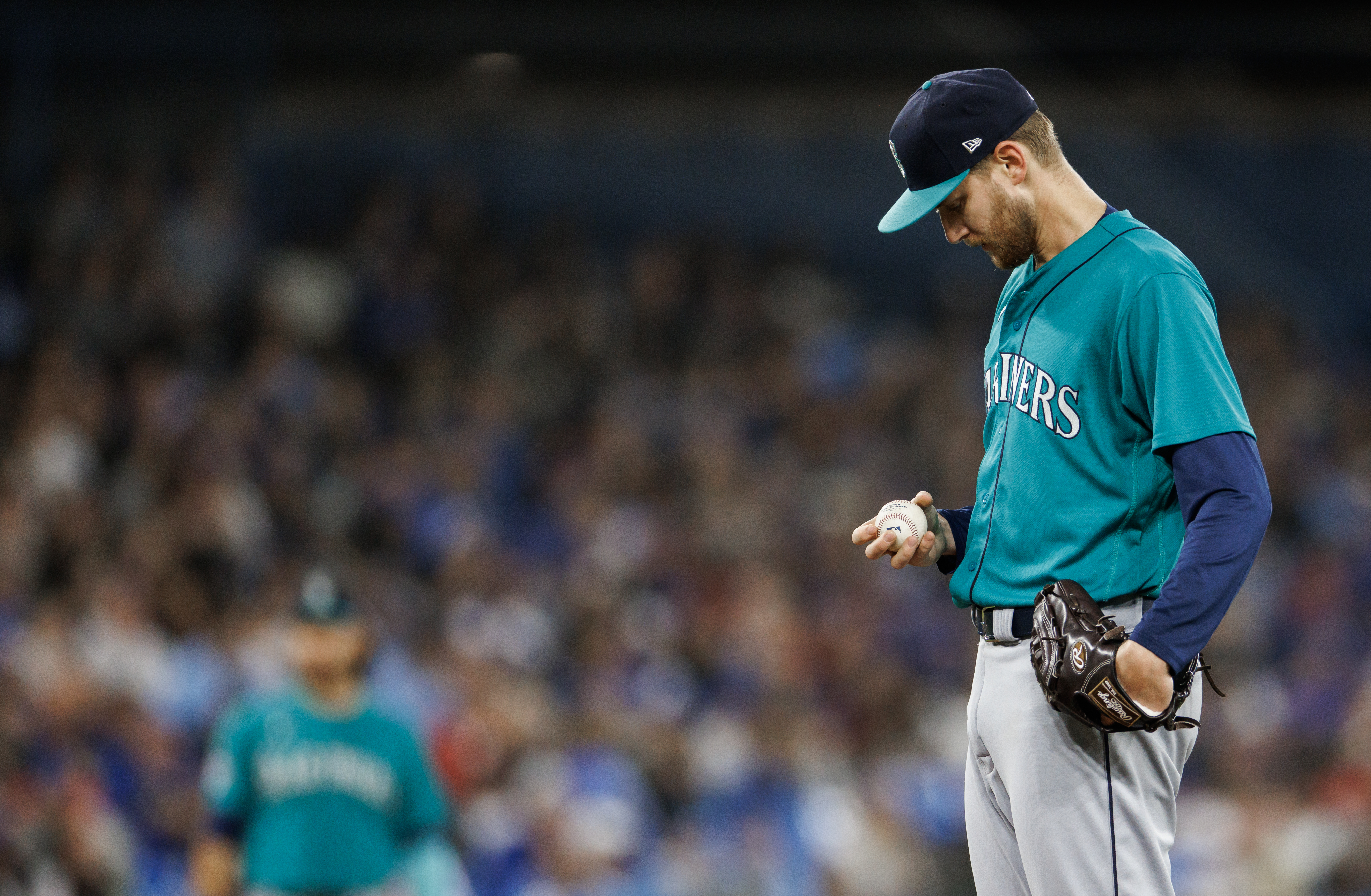 Getty Easton McGee #59 de los Seattle Mariners mira la pelota antes de lanzar en la séptima entrada de su juego de la MLB contra los Toronto Blue Jays en el Rogers Centre el 29 de abril de 2023 en Toronto, Canadá.
