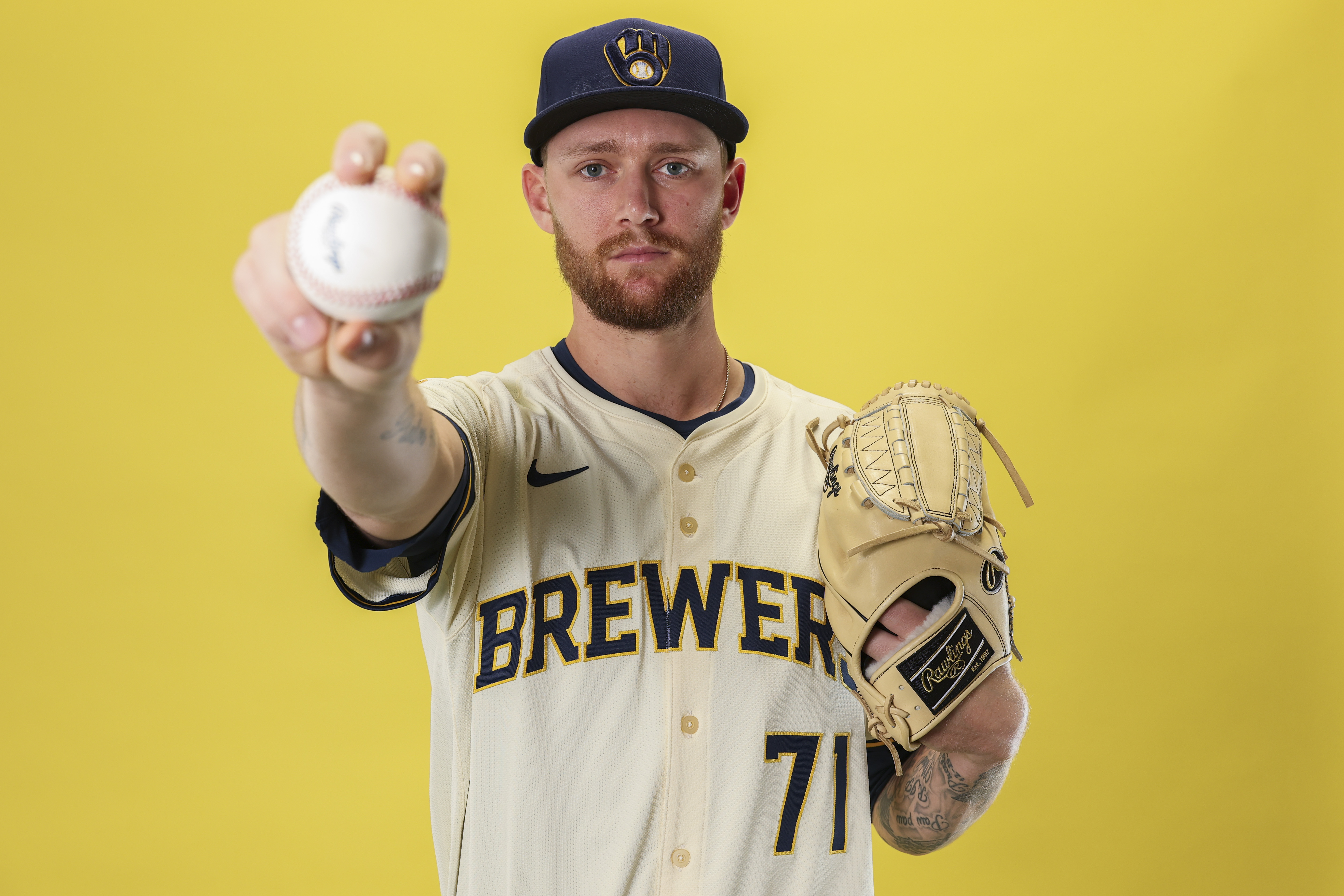 Getty Easton McGee #71 de los Cerveceros de Milwaukee posa para un retrato durante el día de fotos en American Family Fields de Phoenix el 21 de febrero de 2025 en Phoenix, Arizona.
