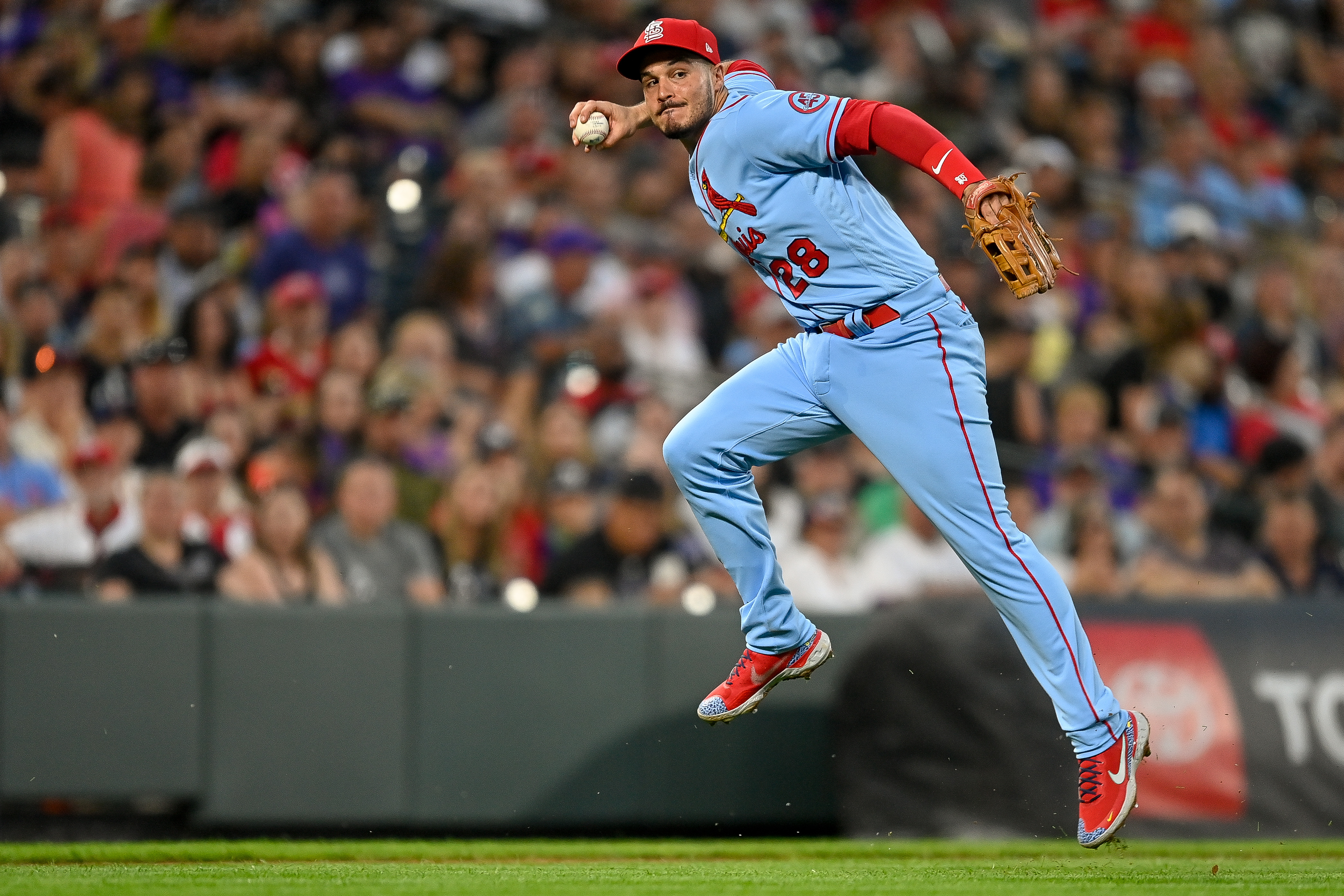 Getty Nolan Arenado #28 de los St. Louis Cardinals salta antes de lanzar a primera base para intentar un out forzado contra los Colorado Rockies en Coors Field el 3 de julio de 2021 en Denver, Colorado.