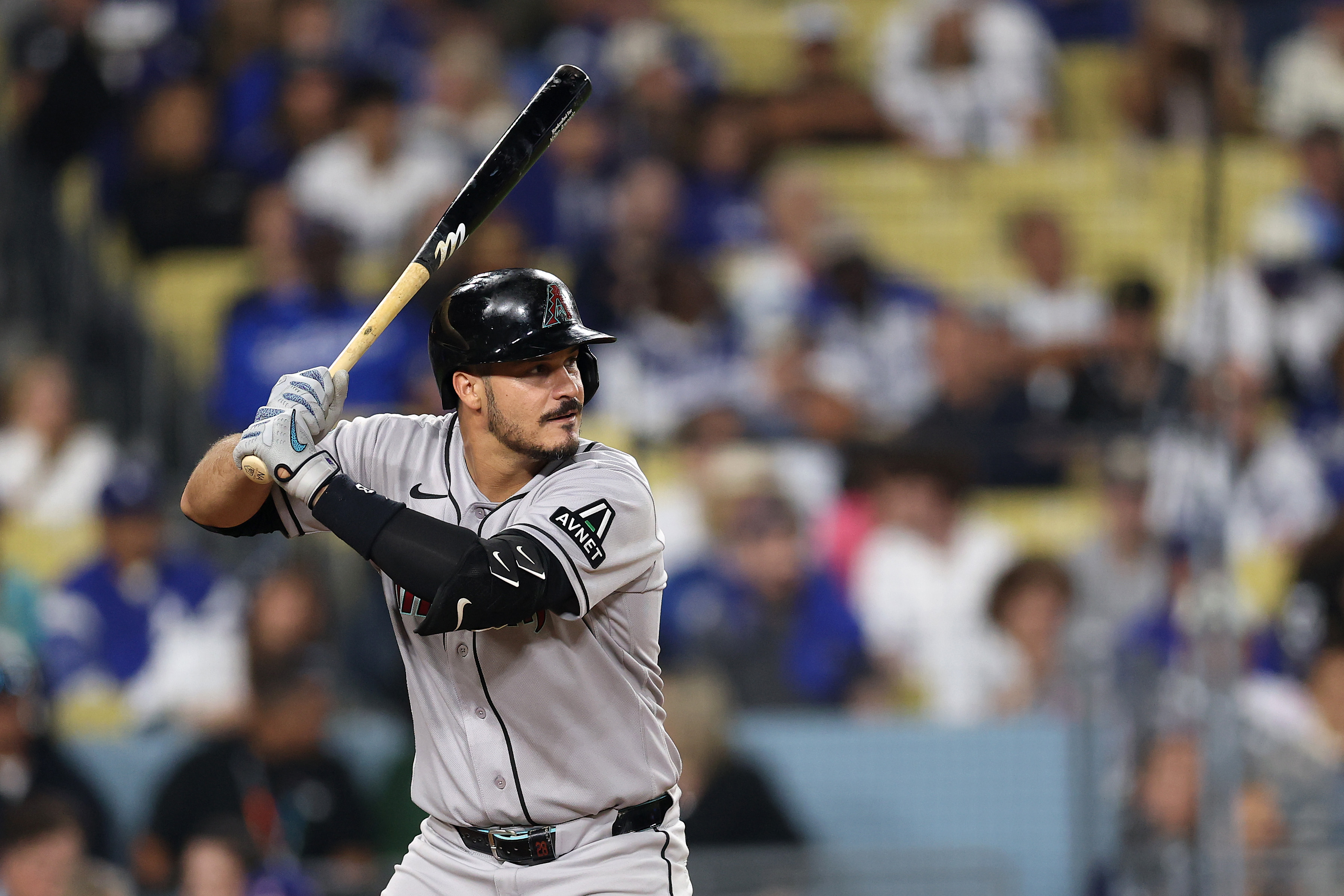 GettyNolan Arenado #28 de los Arizona Diamondbacks en acción al bate contra los Los Angeles Dodgers en el Dodger Stadium el 27 de marzo de 2026 en Los Ángeles, California.