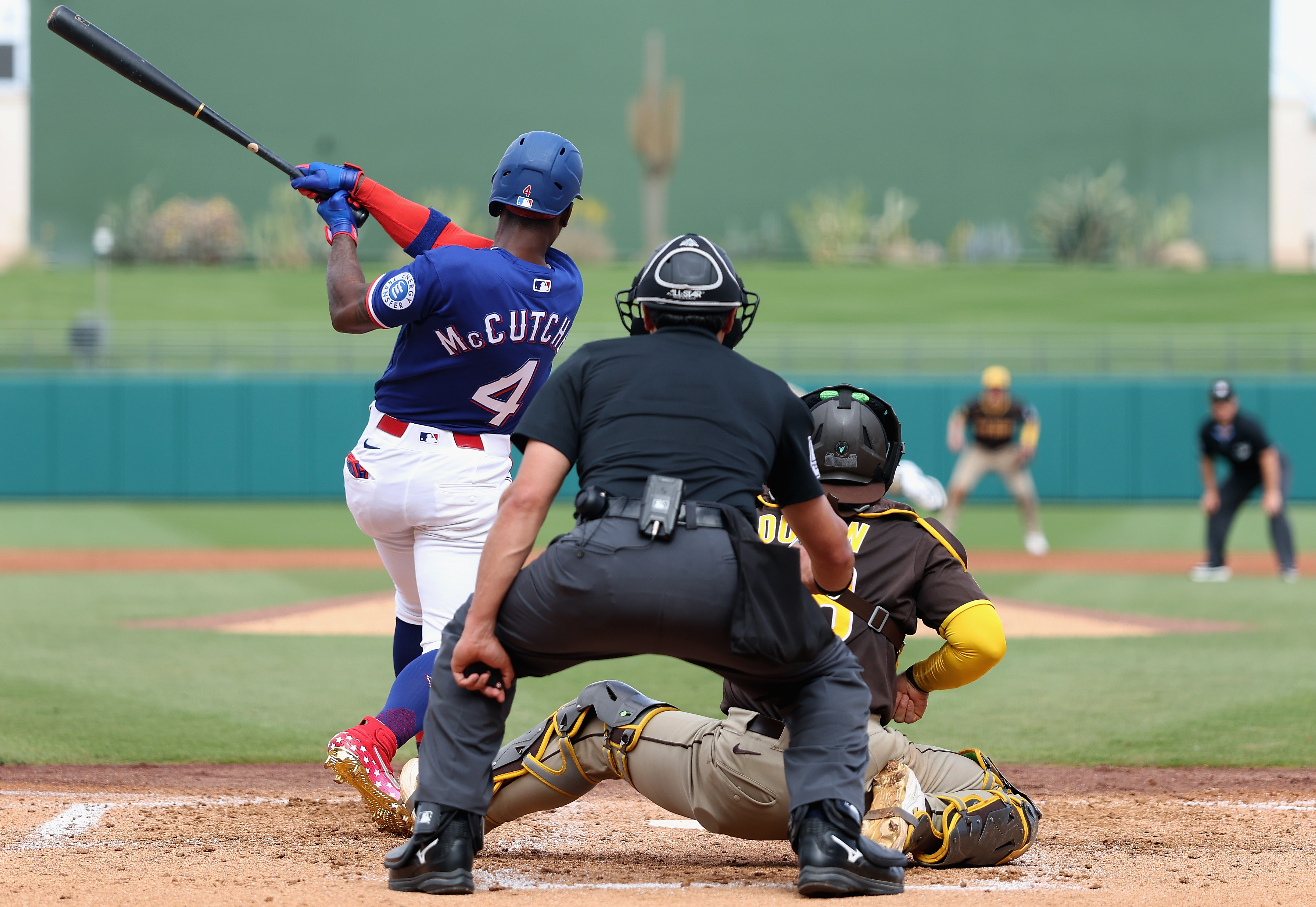 GettySURPRISE, ARIZONA – 14 DE MARZO: Andrew McCutchen #4 de los Texas Rangers batea contra los San Diego Padres durante la tercera entrada del juego de entrenamiento de primavera en el Surprise Stadium el 14 de marzo de 2026 en Surprise, Arizona. (Foto de Christian Petersen/Getty Images)