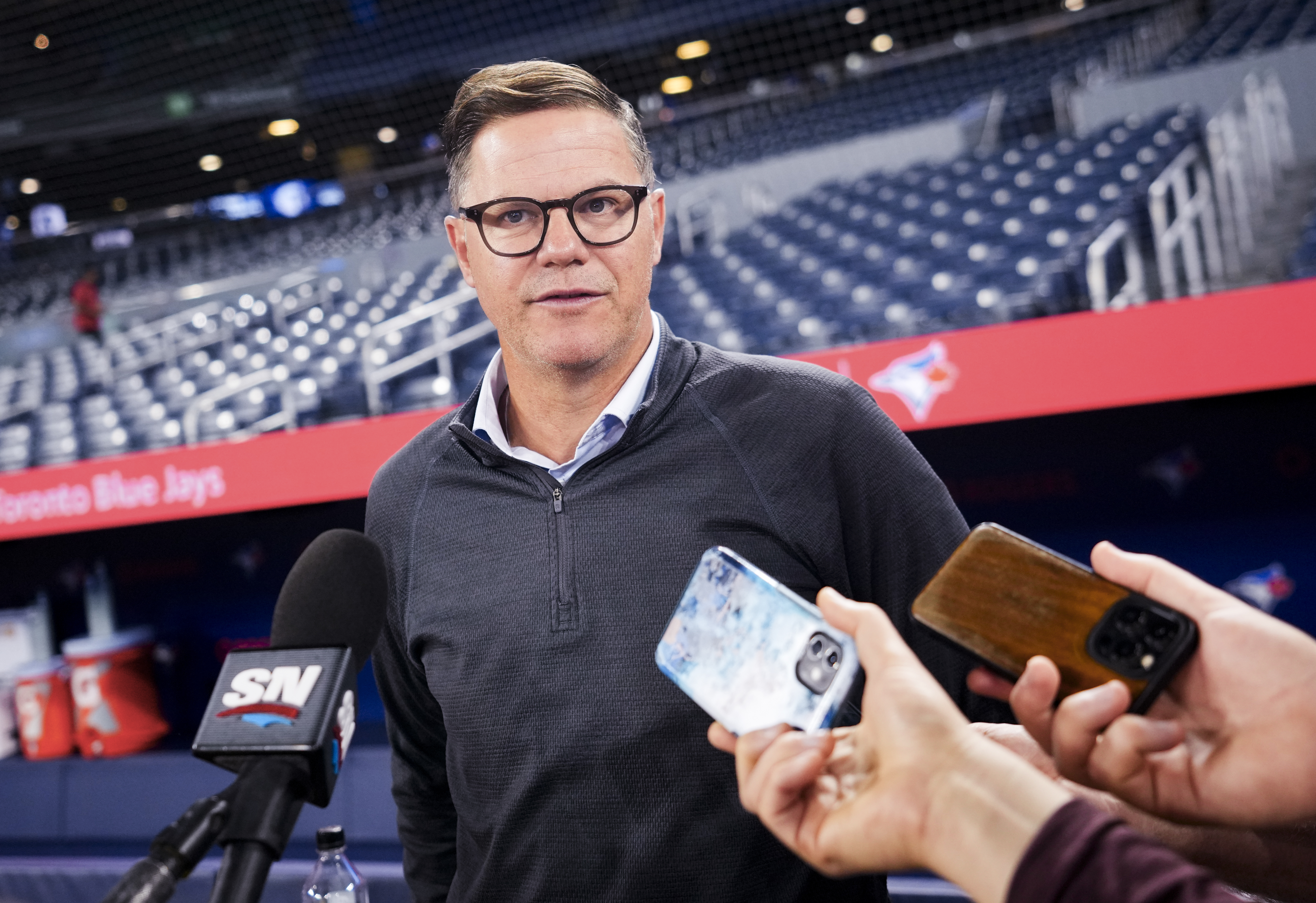 Getty Ross Atkins, gerente general de los Toronto Blue Jays, habla con los medios antes del juego de su equipo de la MLB contra los Tampa Bay Rays en el Rogers Centre el 18 de mayo de 2024 en Toronto, Ontario, Canadá.