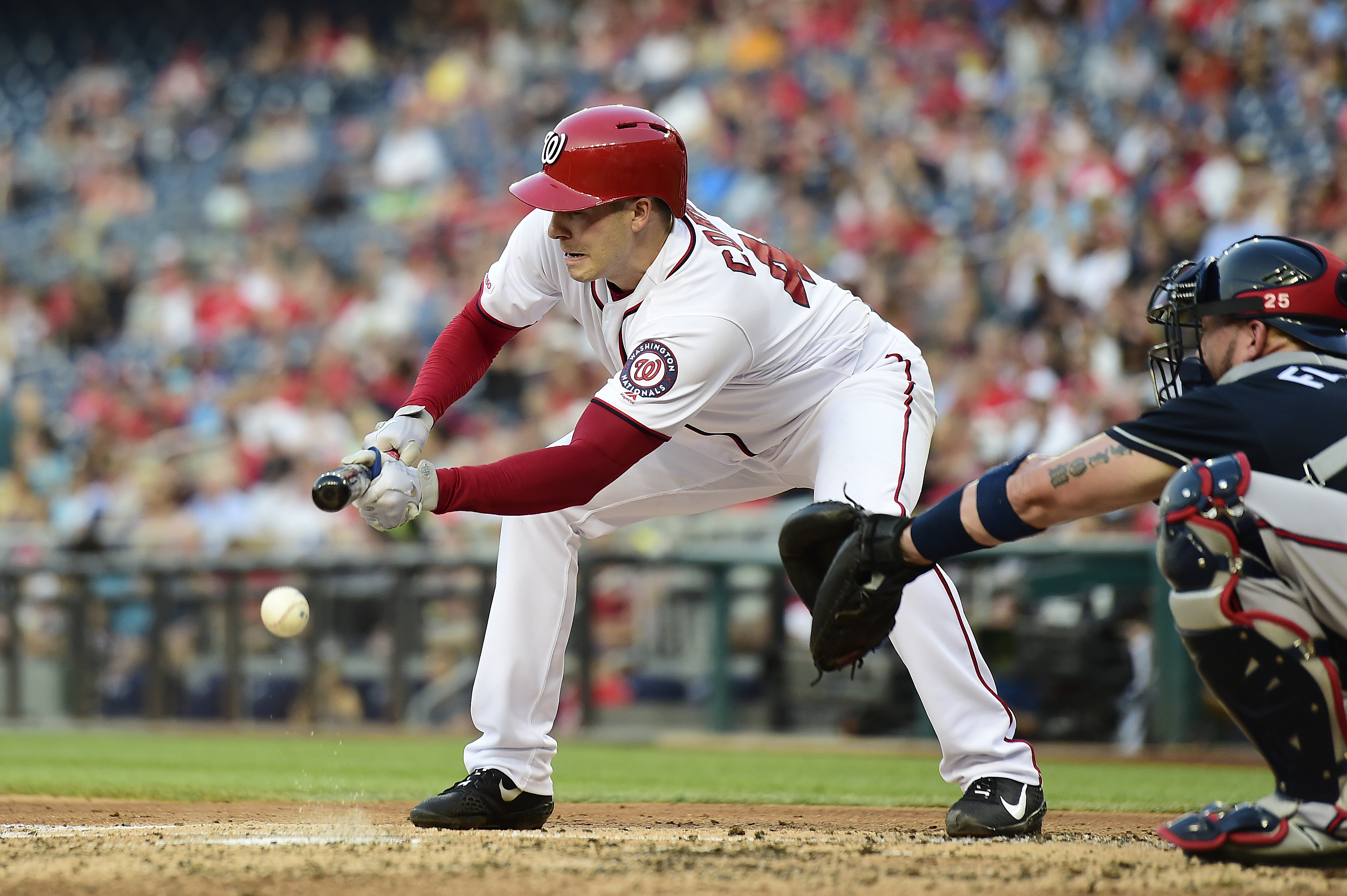 Getty Patrick Corbin #46 de los Washington Nationals conecta un toque de sacrificio contra el receptor Yan Gomes #10 en la segunda entrada contra los Atlanta Braves en el Nationals Park el 29 de julio de 2019 en Washington, DC.