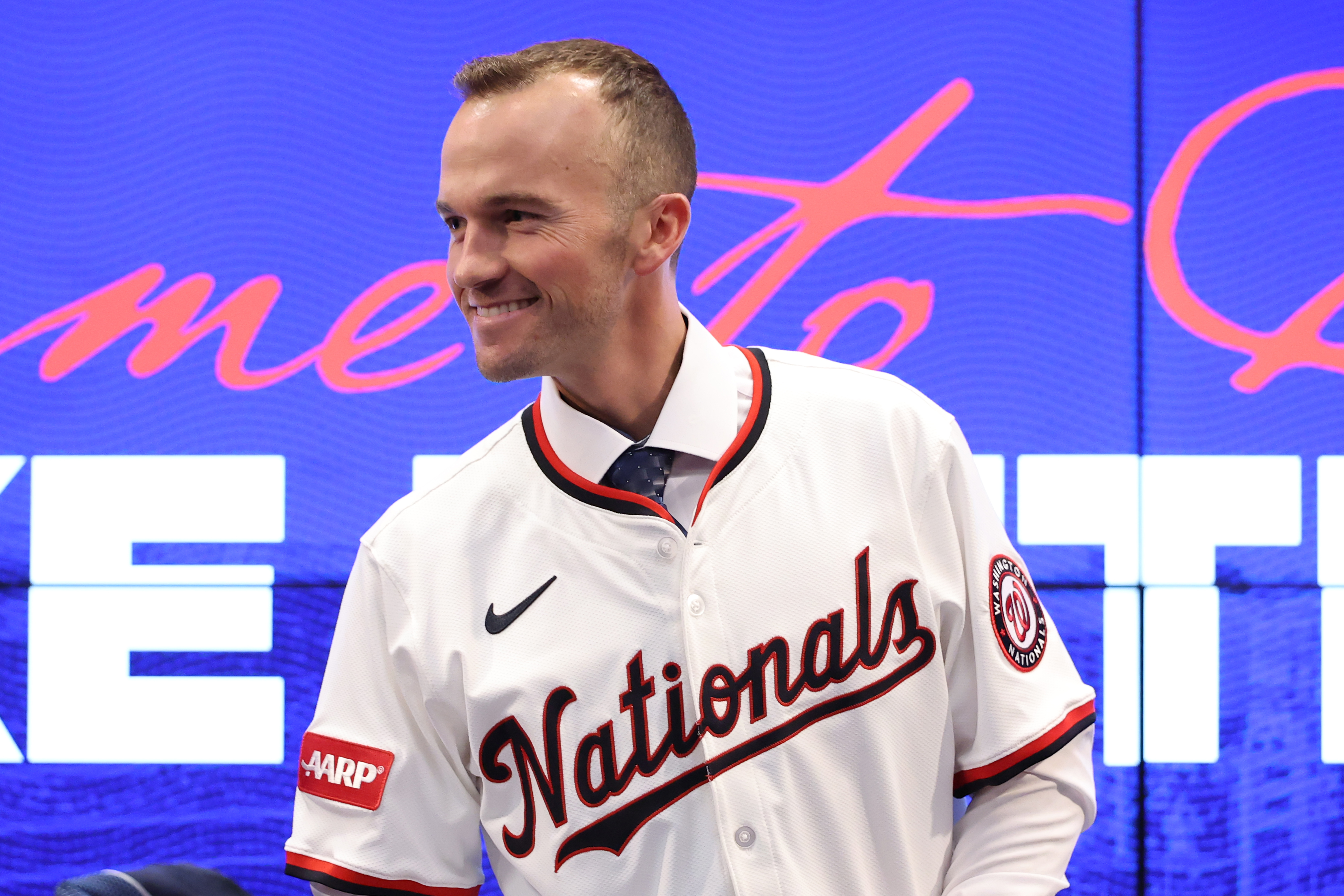 Getty El mánager de los Nacionales de Washington, Blake Butera, sonríe mientras es presentado durante una conferencia de prensa en el Nationals Park el 17 de noviembre de 2025 en Washington, DC. Butera se convirtió en el octavo mánager en la historia del equipo de los Nacionales y el mánager más joven en las Grandes Ligas de Béisbol desde 1972.