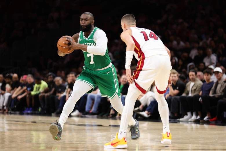 Getty El base de los Boston Celtics, Jaylen Brown, pasa el balón en un partido contra el Heat . (Foto de Megan Briggs/Getty Images)