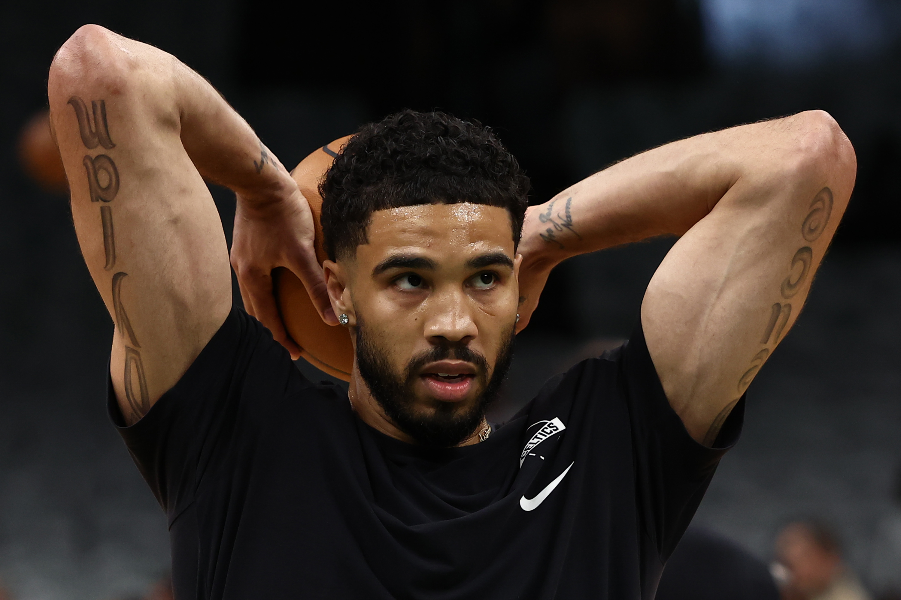 Getty Jayson Tatum #0 de los Boston Celtics calienta antes del Juego Uno de la Primera Ronda de la Conferencia Este de los Playoffs de la NBA contra los Philadelphia 76ers en el TD Garden el 19 de abril de 2026 en Boston, Massachusetts.