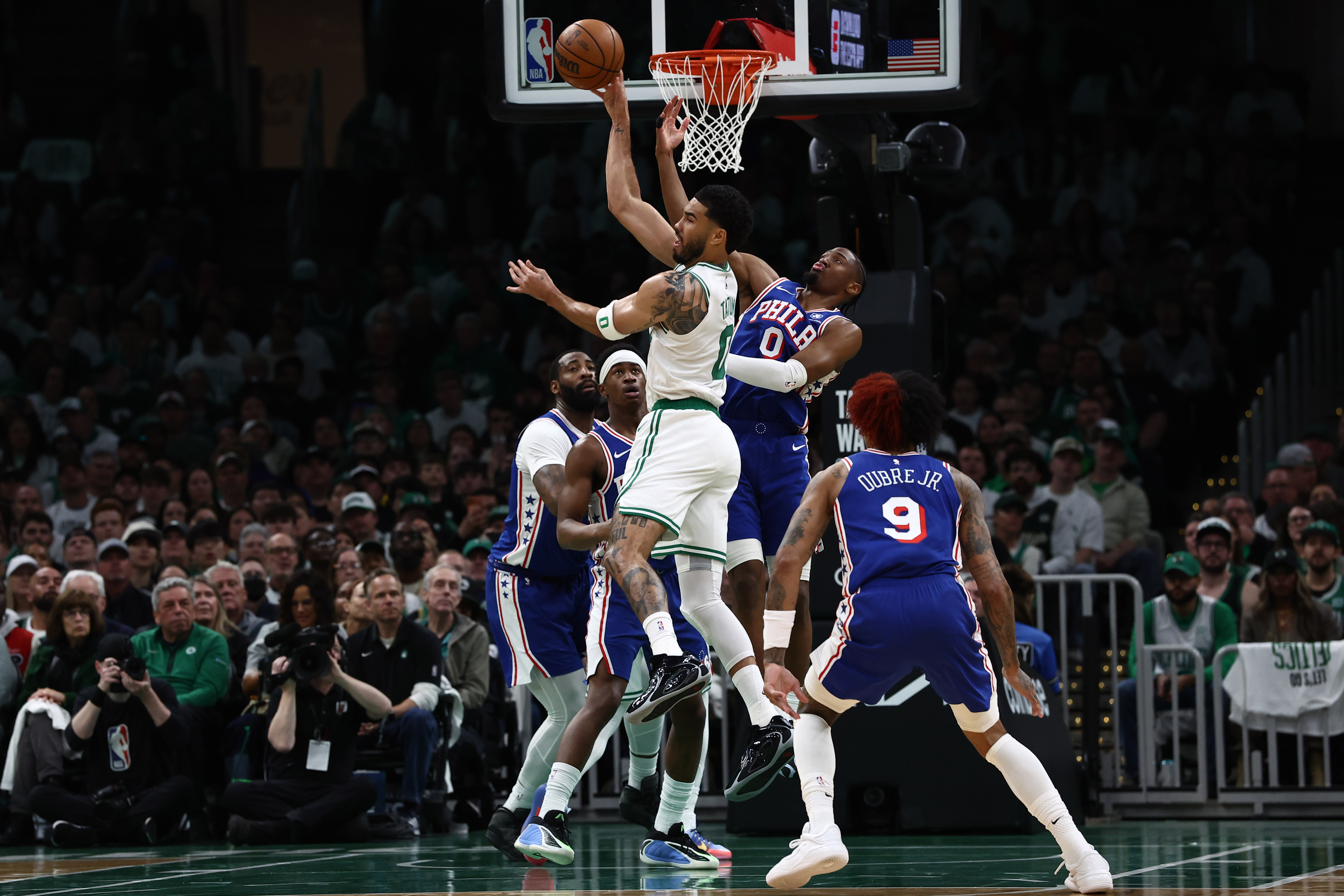 Getty Jayson Tatum #0 de los Boston Celtics captura un rebote sobre Paul George #8 de los Philadelphia 76ers y Andre Drummond #1 durante el primer cuarto del Juego Uno de la Primera Ronda de la Conferencia Este NBA Playoffs en el TD Garden el 19 de abril de 2026 en Boston, Massachusetts.