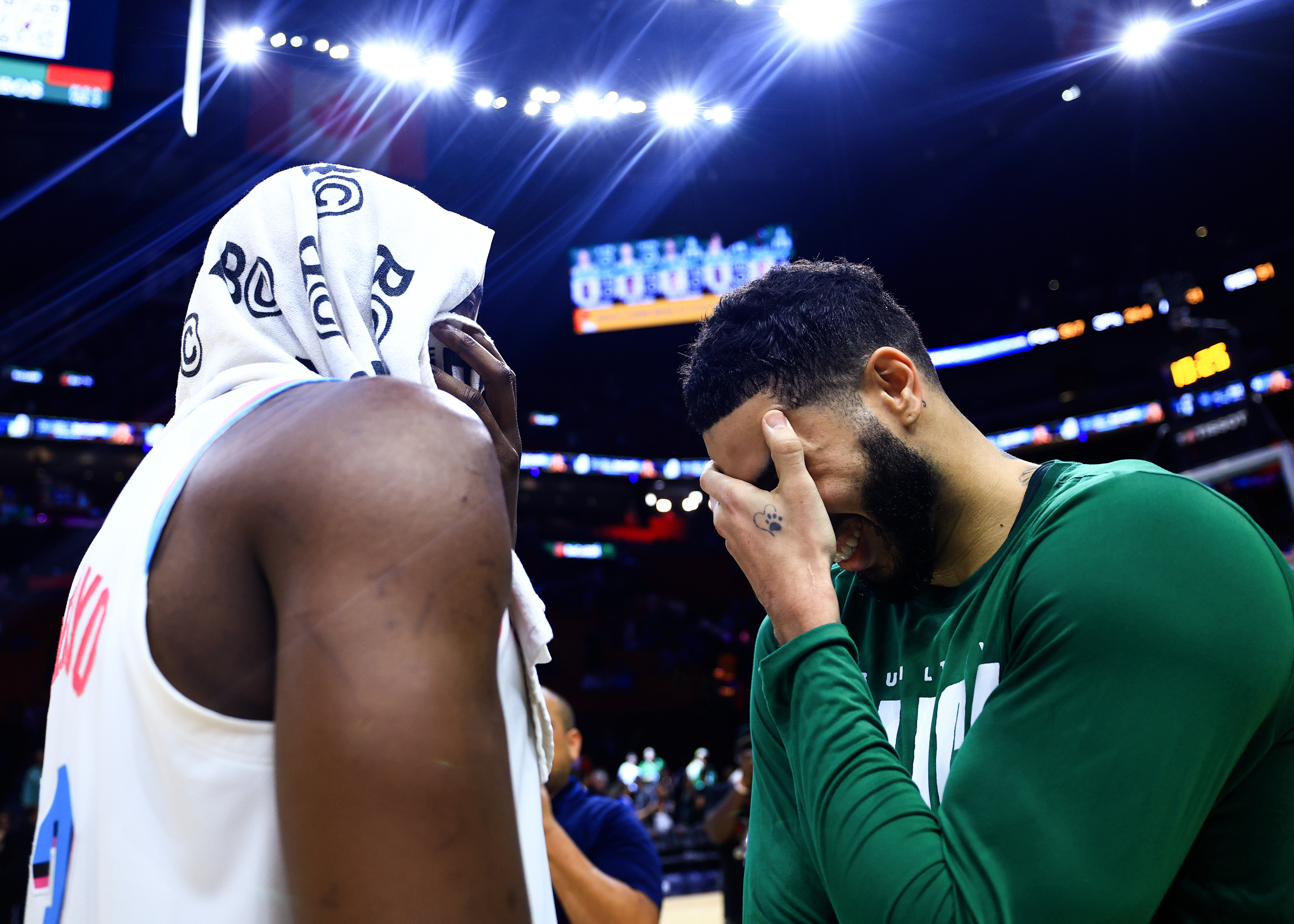Getty Jayson Tatum #0 de los Boston Celtics comparte una risa con Bam Adebayo #13 del Miami Heat después de un partido en el Kaseya Center el 10 de febrero de 2025 en Miami, Florida.