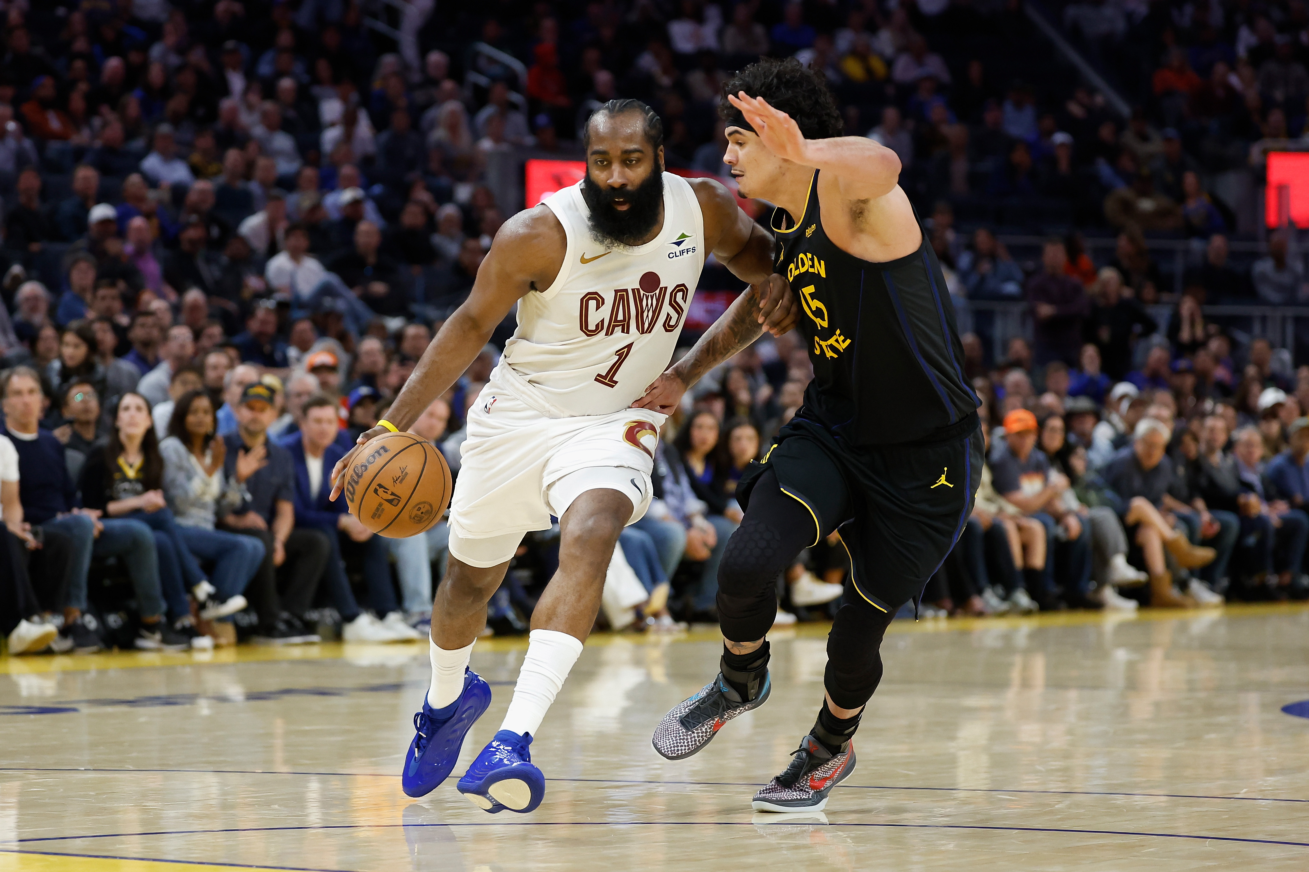 Getty James Harden #1 de los Cleveland Cavaliers penetra a la canasta contra Gui Santos #15 de los Golden State Warriors en el cuarto cuarto en el Chase Center el 02 de abril de 2026 en San Francisco, California.