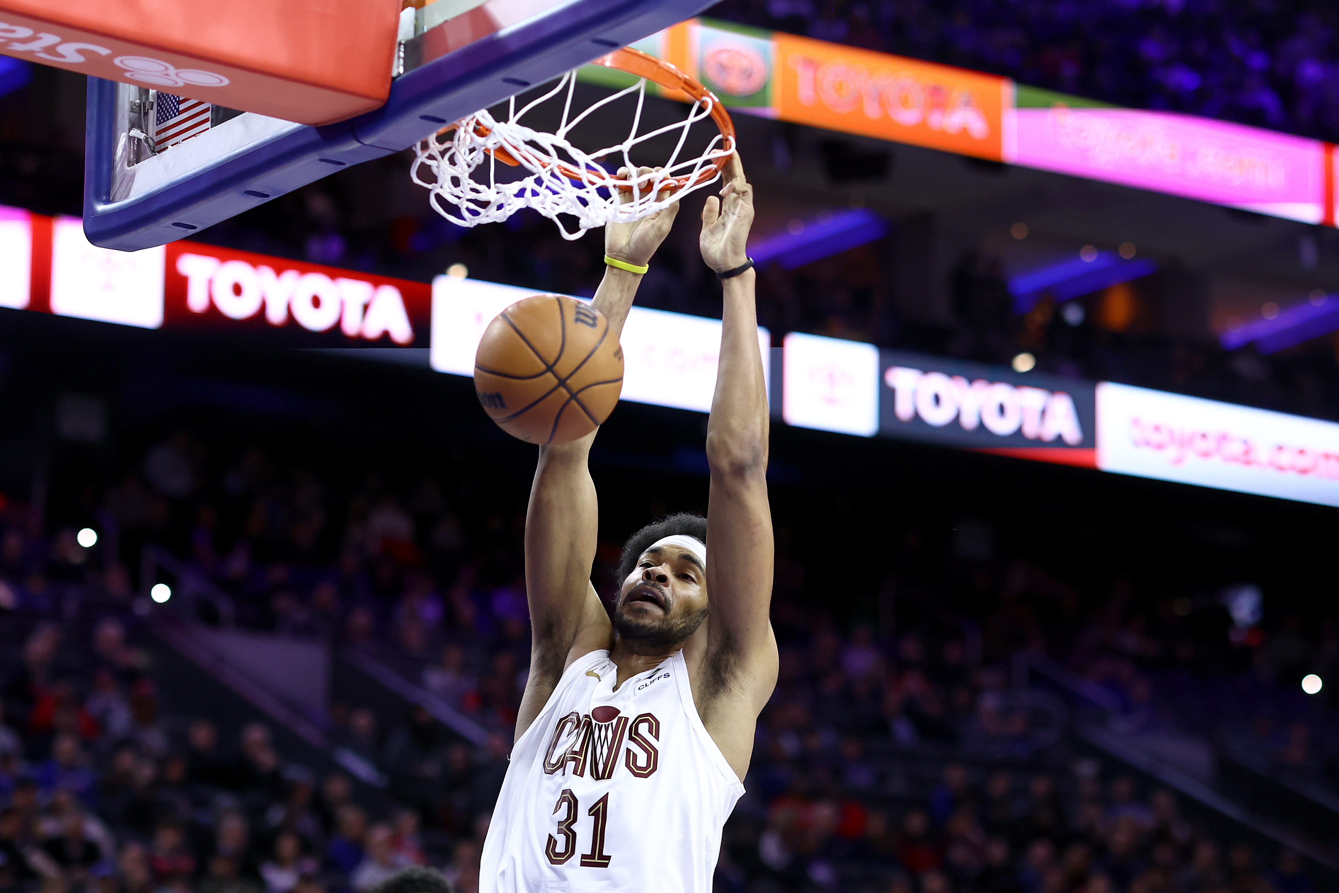 Getty FILADELFIA, PENSILVANIA – 23 DE FEBRERO: Jarrett Allen #31 de los Cleveland Cavaliers hace un mate durante el último cuarto contra los Philadelphia 76ers en el Wells Fargo Center el 23 de febrero de 2024 en Filadelfia, Pensilvania. (Foto de Tim Nwachukwu/Getty Images)