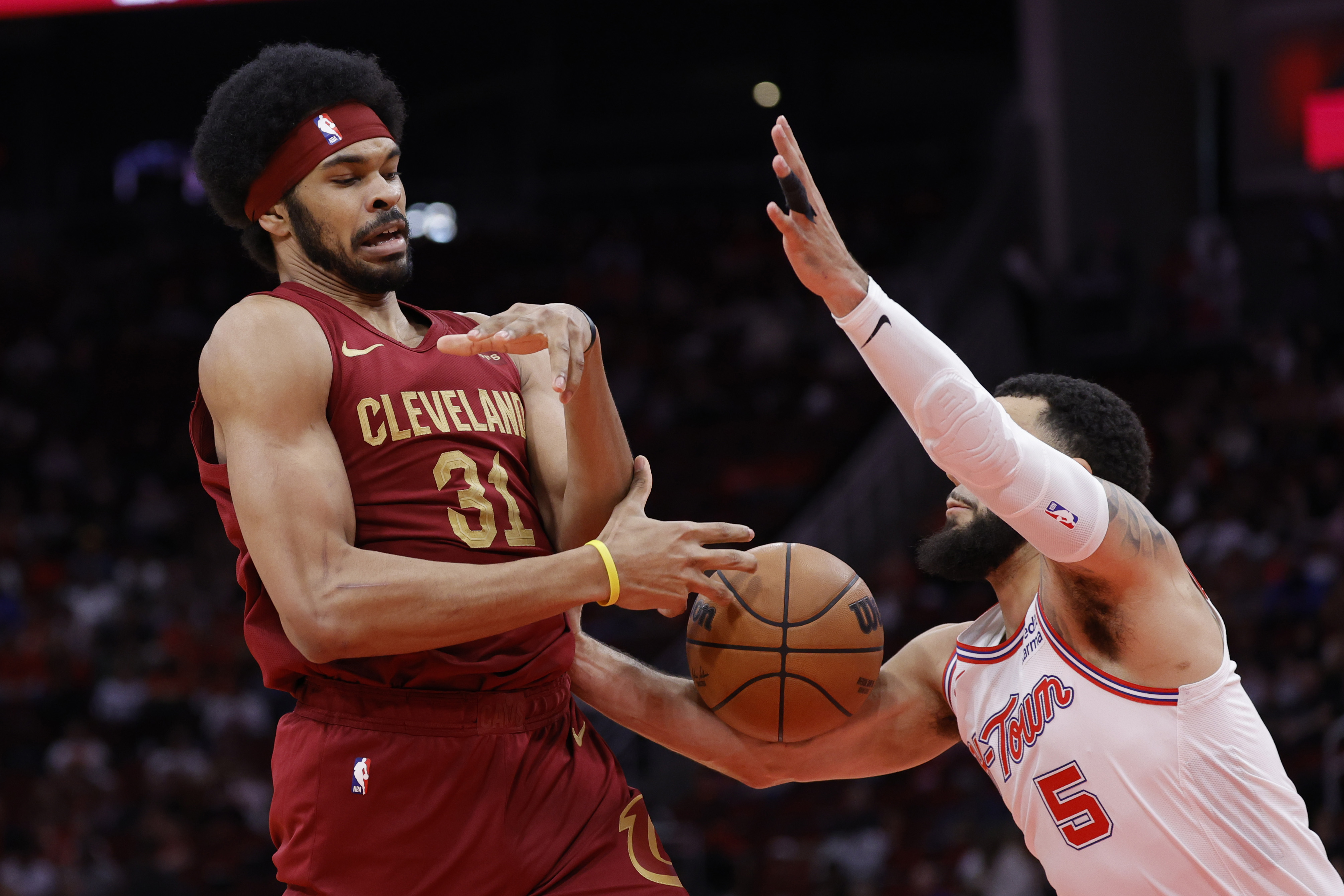 Getty HOUSTON, TEXAS – 16 DE MARZO: Fred VanVleet #5 de los Houston Rockets defiende a Jarrett Allen #31 de los Cleveland Cavaliers durante la primera mitad en el Toyota Center el 16 de marzo de 2024 en Houston, Texas. (Foto de Carmen Mandato/Getty Images)