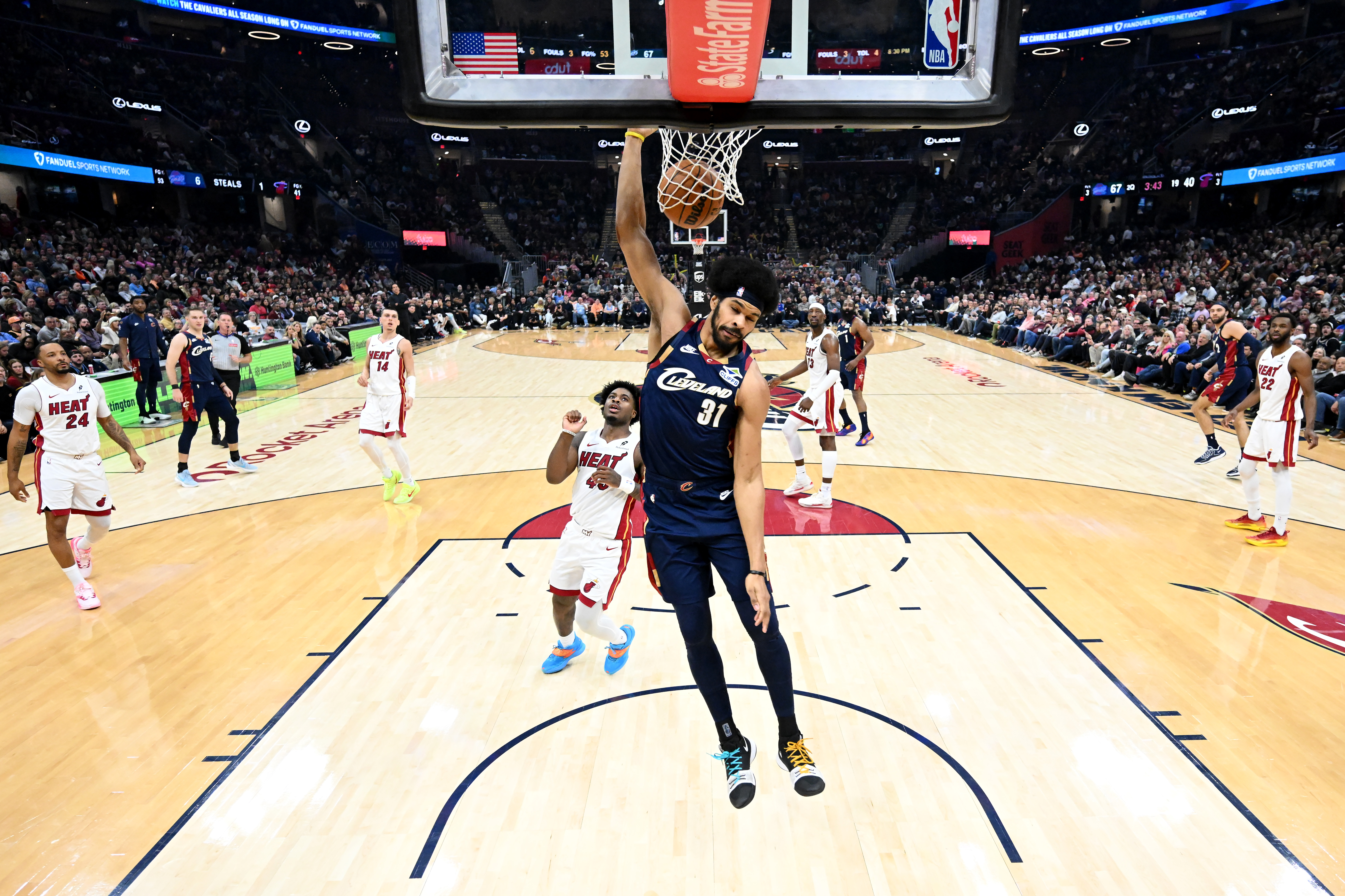 Getty Jarrett Allen #31 de los Cleveland Cavaliers hace un mate durante el segundo cuarto contra el Miami Heat en el Rocket Arena el 27 de marzo de 2026 en Cleveland, Ohio. Los Cavaliers derrotaron al Heat 149-128.