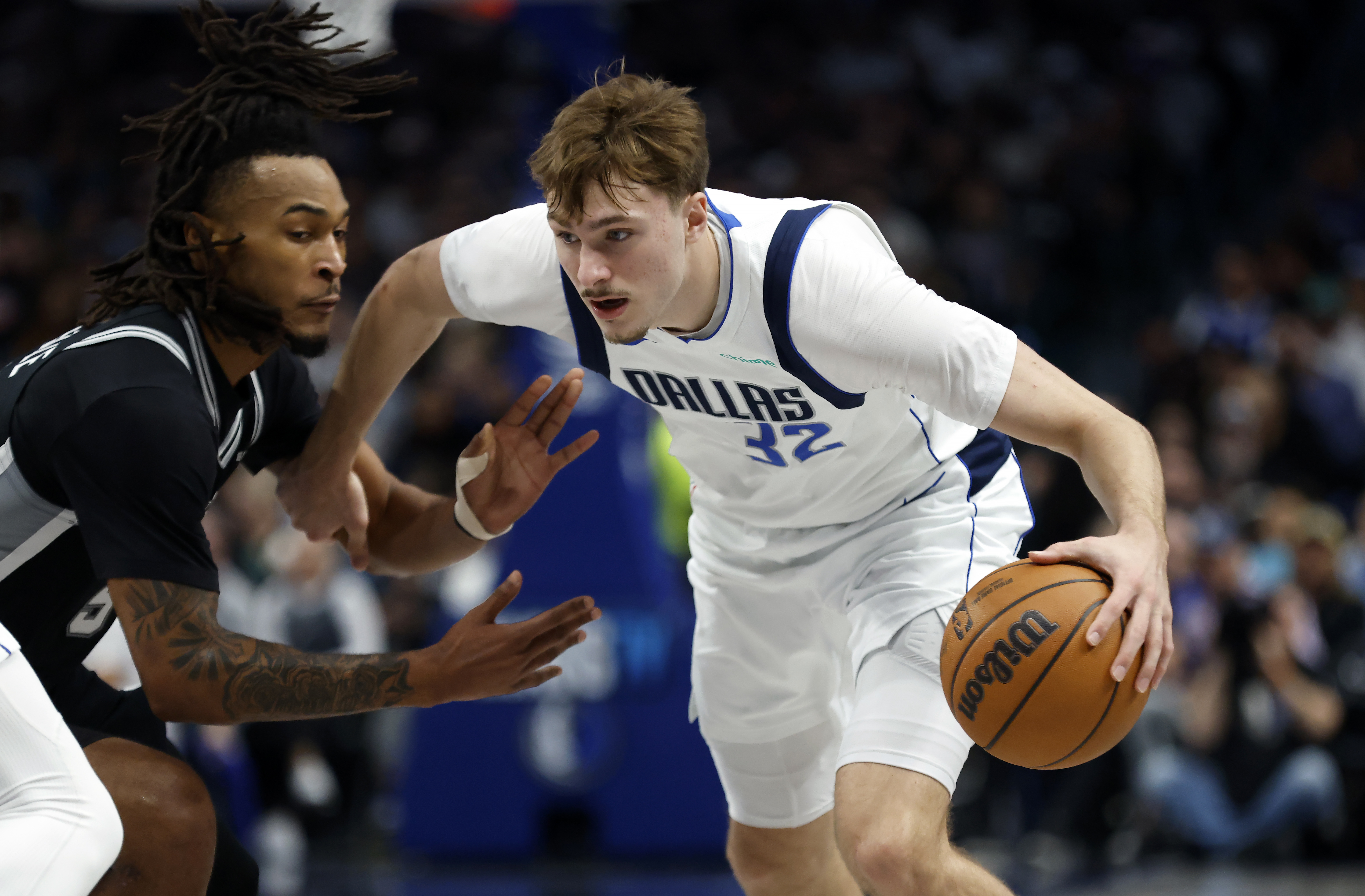 Getty DALLAS, TEXAS – 5 DE FEBRERO: Cooper Flagg #32 de los Dallas Mavericks maneja el balón mientras Stephon Castle #5 de los San Antonio Spurs defiende durante la primera mitad en el American Airlines Center el 5 de febrero de 2026 en Dallas, Texas. (Foto de Ron Jenkins/Getty Images) Flagg promedia 20.4 puntos, 6.5 rebotes, 4.1 asistencias y 1.2 robos por partido mientras dispara 48.2% desde el campo y 30.2% desde el rango de tres puntos en 49 juegos.