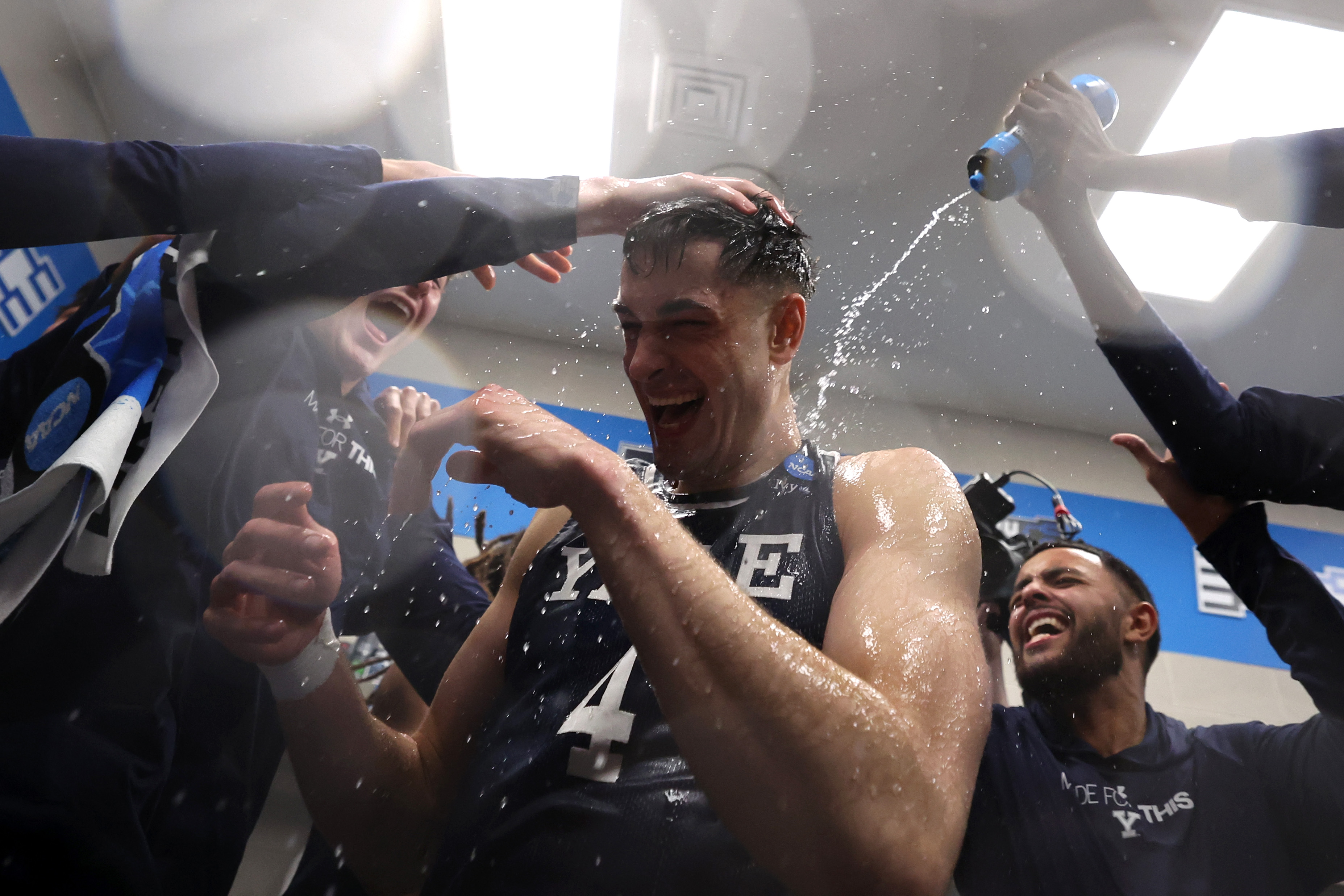 Getty SPOKANE, WASHINGTON – 22 DE MARZO: John Poulakidas # 4 de los Yale Bulldogs es bañado por sus compañeros de equipo en el vestuario después de una victoria de 78-76 contra los Auburn Tigers en la primera ronda del Torneo de Baloncesto Masculino de la NCAA en Spokane Veterans Memorial Arena el 22 de marzo de 2024 en Spokane, Washington. (Foto de Steph Chambers/Getty Images)
